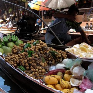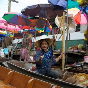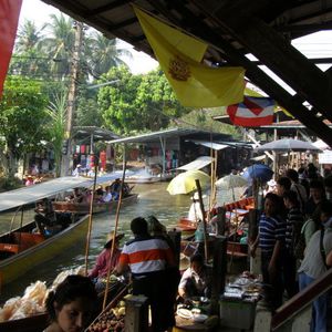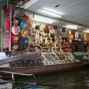 水上マーケットは、ボート上での水上生活者お家をながめたりできる時間がたっぷりあったのが良かったです。ただ、お土産屋さんは、バンコク市内の倍以上で吹っかけてくるので、値段を参考にする程度で、買わないことをお勧めします。私は吹っかけ値の半額以下で象の刺繍のバックを買いました。それでもちょっと高いかな・・と思いましたが。幸いというか、バンコク市内の私の回ったお店では見つけられないデザインだったので購入しておいて良かったのですが、デザイン違いのもので値段を聞いてみると、私の購入価格より、さらに簡単に80バーツ下がりました。