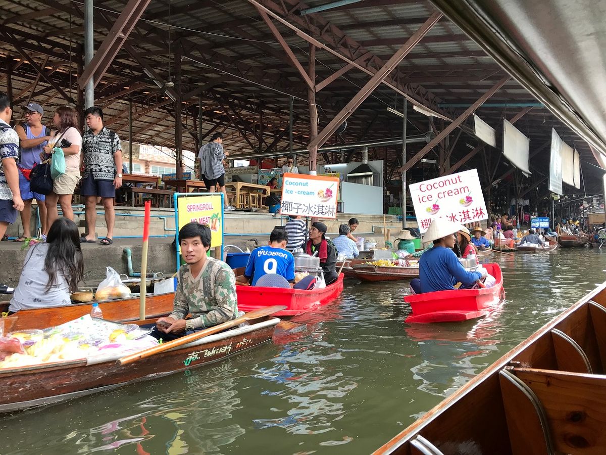 ボートに乗りグルーっと一周。値段交渉して手に入れたココナッツアイスクリームは格別。ガイドさんの配慮で、混む前の時間帯に連れて行ってくれてラッキーでした。最後の方は混み始め、船たちが渋滞していました。