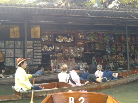 ダムヌンサドアク水上マーケットでは舟に乗りながらココナッツアイスを買って食べましたちょーうまうまです。タイラーメンを逃してしまいガックリ!途中大混雑で他の舟とよく接触、体にも当たっていました。水路の両脇はお土産物でぎっしり見ごたえありとても楽しい時間でした。