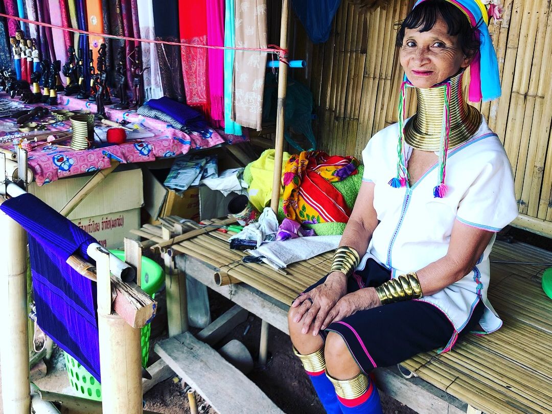 思ったよりも揺れるのでびっくりしましたが象さんたち可愛かったです。ここのパークの自由行動で、首長族に会ってきました。とてもカラフルな織物を織っていて綺麗な皆さんでした。