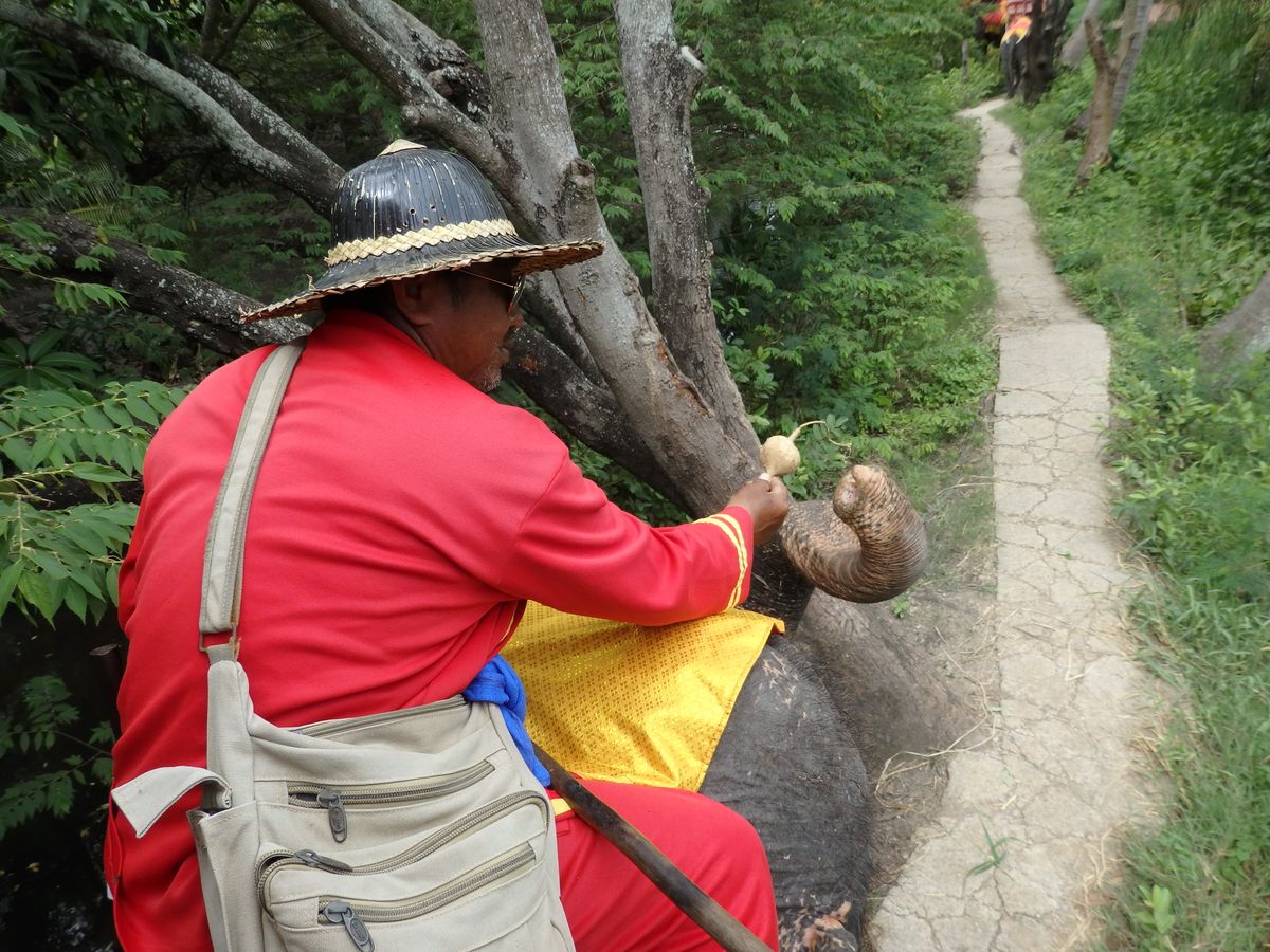 乗り場入口で売ってる象のおやつはかご1杯のおいもが100バーツ。乗ってる間にときどき象使いに手渡し、象に与えます。食べてる象の顔は見えませんが、ちょっと面白かったです。