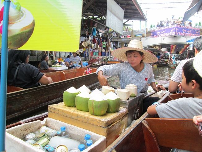 ココナッツファーム?→象乗り→水上マーケットの順で廻りました。水上マーケットはエンジン付きボートか手漕ぎボートを選べるのですが、当方は後者を選びました。いろんなお店に近くまで近づけ、かつすれ違ったお店のボートで買い物がしたいと思ったらUターンしてくれました。途中、飲みきりサイズのお水が2回頂けたので良い水分補給になりました。
