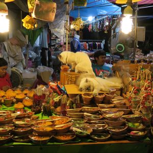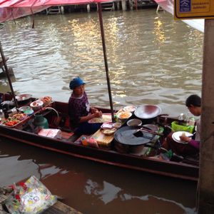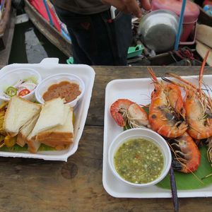 市内のあちこちでマーケットや屋台街を見て回った後なので、もはや目新しさは感じないが、水上に浮かぶ小舟で料理を作って岸辺のテーブル席に陣取るお客さんに料理を提供する様子は他では見られないので面白い。