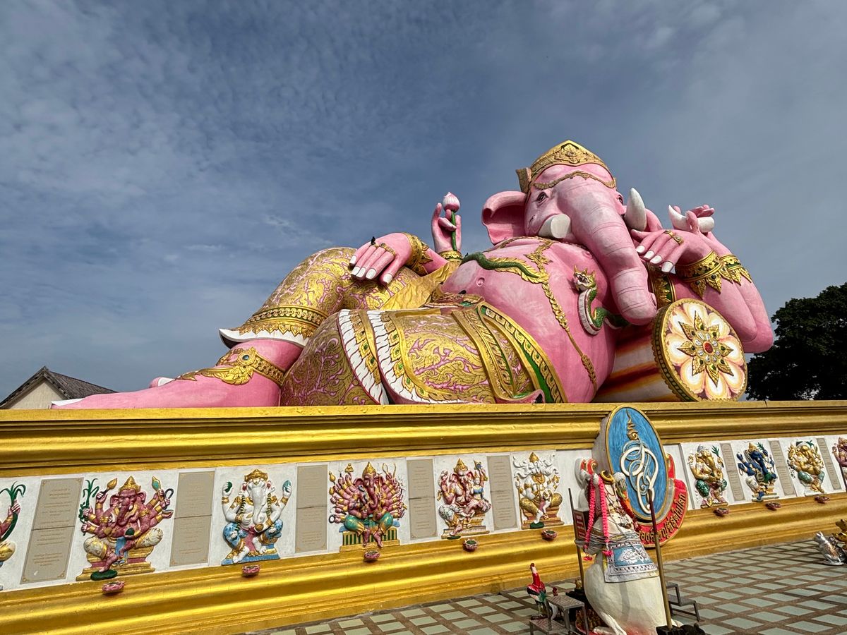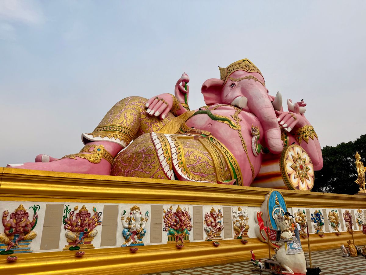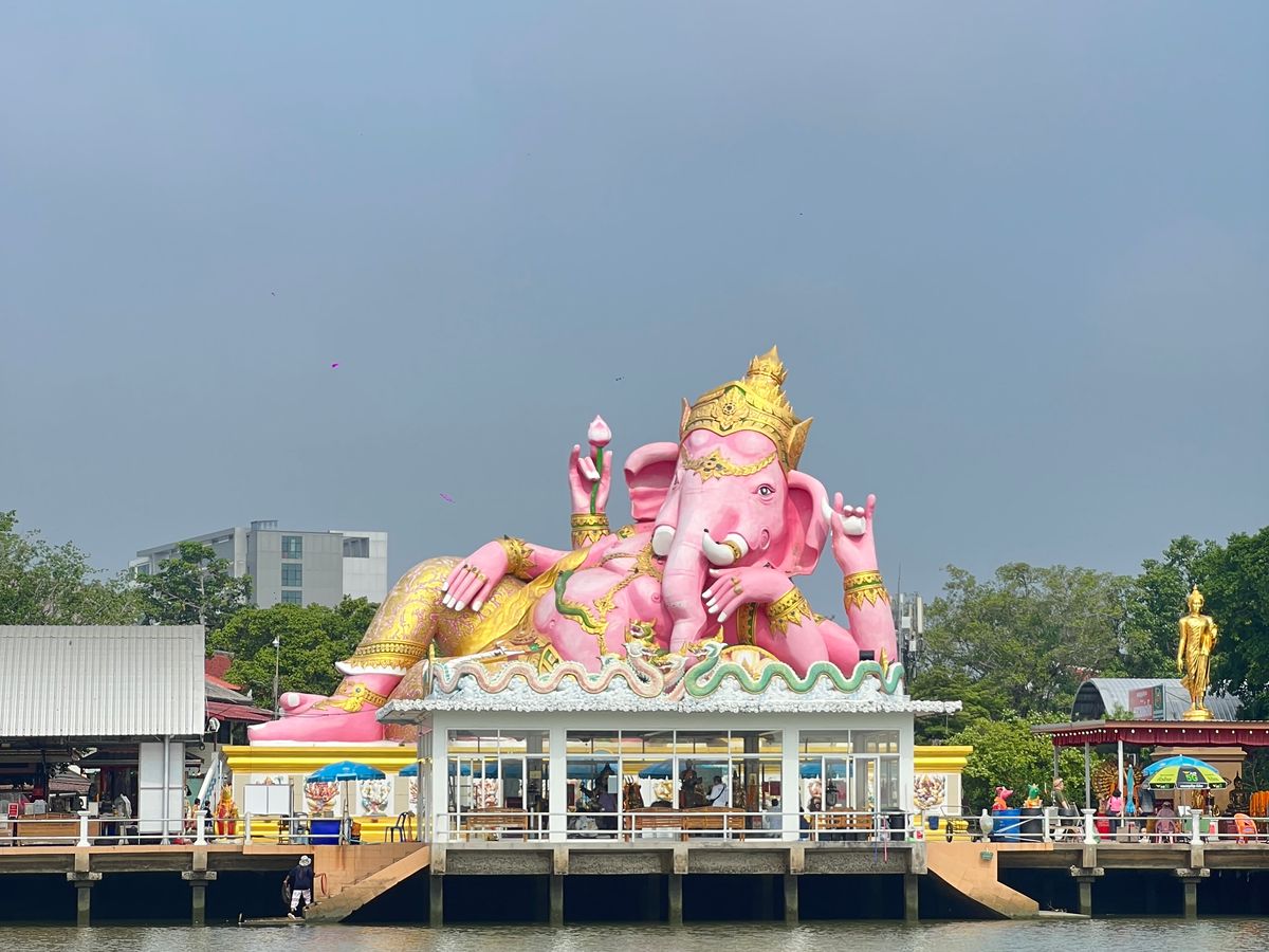 ピンクガネーシャへ行きたくて、行き方を調べましたが、個人ではピンクガネーシャへ行くだけで精一杯。ツアーを調べたら、なんと王女誕生日特別SL運行日でSLでピンクガネーシャ以外にも色々行けるツアーを発見!即申し込みました。特別運行SLは、ローカルの方とボックス席向かい合わせ席で、カタコトの英語で、時には翻訳アプリを介しながら、たくさん会話していただきました。次は7月にアユタヤ行きのSL運行があるとも。とても楽しみにされているようでした。線路際にもSLへ手を振っている方々が多く、スペシャル感を感じました。現地に到着し、市場やタイ料理のランチ、金ピカのお寺、巨大青銅ガネーシャ像、ピンクガネーシャを回り、ただの観光地ではない現地の方の風習、信仰心を垣間見せていただいた感じがしました。1番の目的のピンクガネーシャがまさかの改装工事中でしたが、それも気にならないほどのいいツアーでした。レストランの席もグループごと別々だったり、冷たいお水おしぼりのサービスまであり有り難かったです。集合場所も行ってみたかった荘厳な雰囲気満載のフアラムポーン駅、解散場所もバンコク中心部のプロンポン駅でツアー後は高級デパートを回れて、有意義な一日を過ごせました。細部まで考えられている大満足なツアーで母娘旅行のいい思い出になりました。