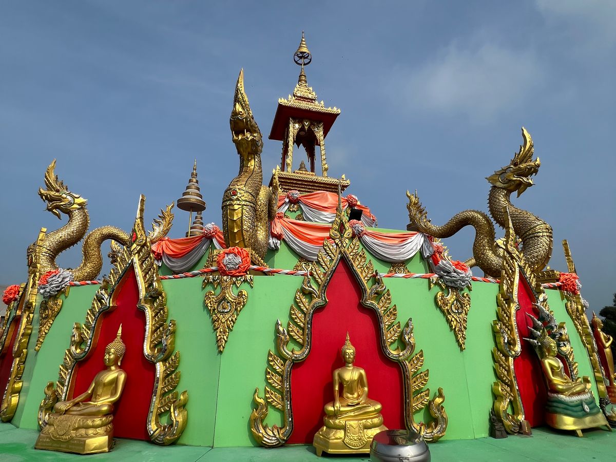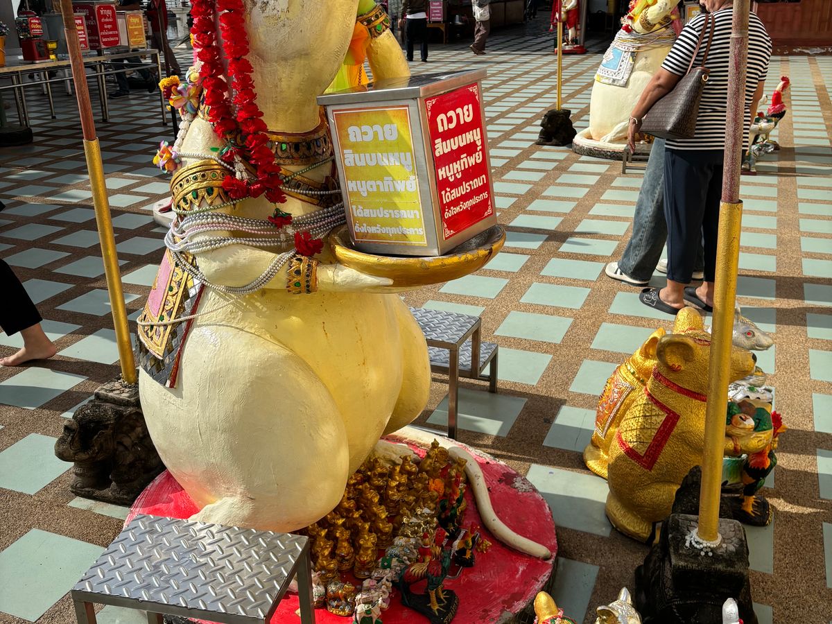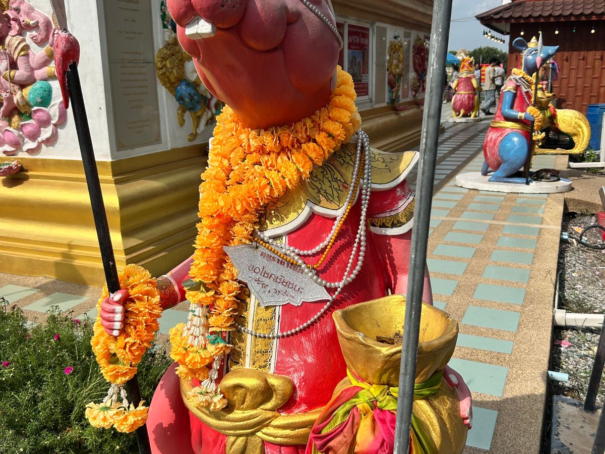 ピンクガネーシャへ行きたくて、行き方を調べましたが、個人ではピンクガネーシャへ行くだけで精一杯。ツアーを調べたら、なんと王女誕生日特別SL運行日でSLでピンクガネーシャ以外にも色々行けるツアーを発見!即申し込みました。特別運行SLは、ローカルの方とボックス席向かい合わせ席で、カタコトの英語で、時には翻訳アプリを介しながら、たくさん会話していただきました。次は7月にアユタヤ行きのSL運行があるとも。とても楽しみにされているようでした。線路際にもSLへ手を振っている方々が多く、スペシャル感を感じました。現地に到着し、市場やタイ料理のランチ、金ピカのお寺、巨大青銅ガネーシャ像、ピンクガネーシャを回り、ただの観光地ではない現地の方の風習、信仰心を垣間見せていただいた感じがしました。1番の目的のピンクガネーシャがまさかの改装工事中でしたが、それも気にならないほどのいいツアーでした。レストランの席もグループごと別々だったり、冷たいお水おしぼりのサービスまであり有り難かったです。集合場所も行ってみたかった荘厳な雰囲気満載のフアラムポーン駅、解散場所もバンコク中心部のプロンポン駅でツアー後は高級デパートを回れて、有意義な一日を過ごせました。細部まで考えられている大満足なツアーで母娘旅行のいい思い出になりました。