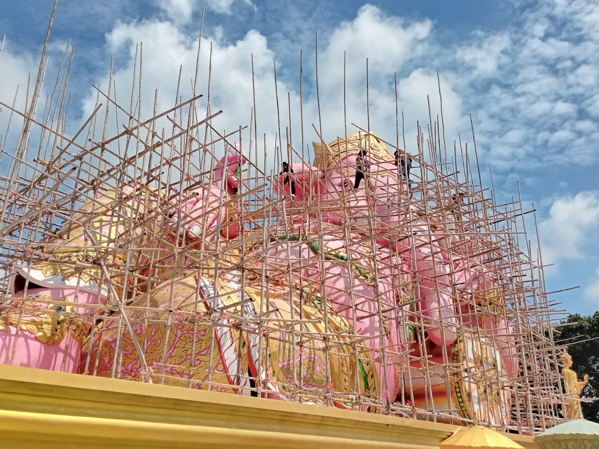 竹の足場で囲まれて捕まったピンクガネーシャになっていました。