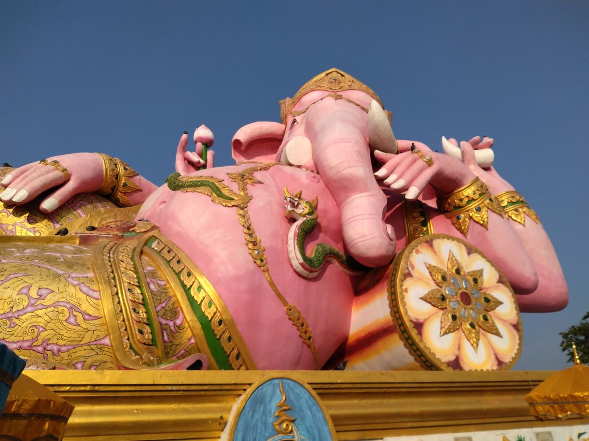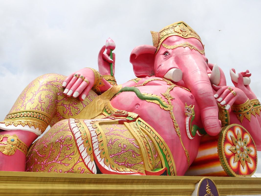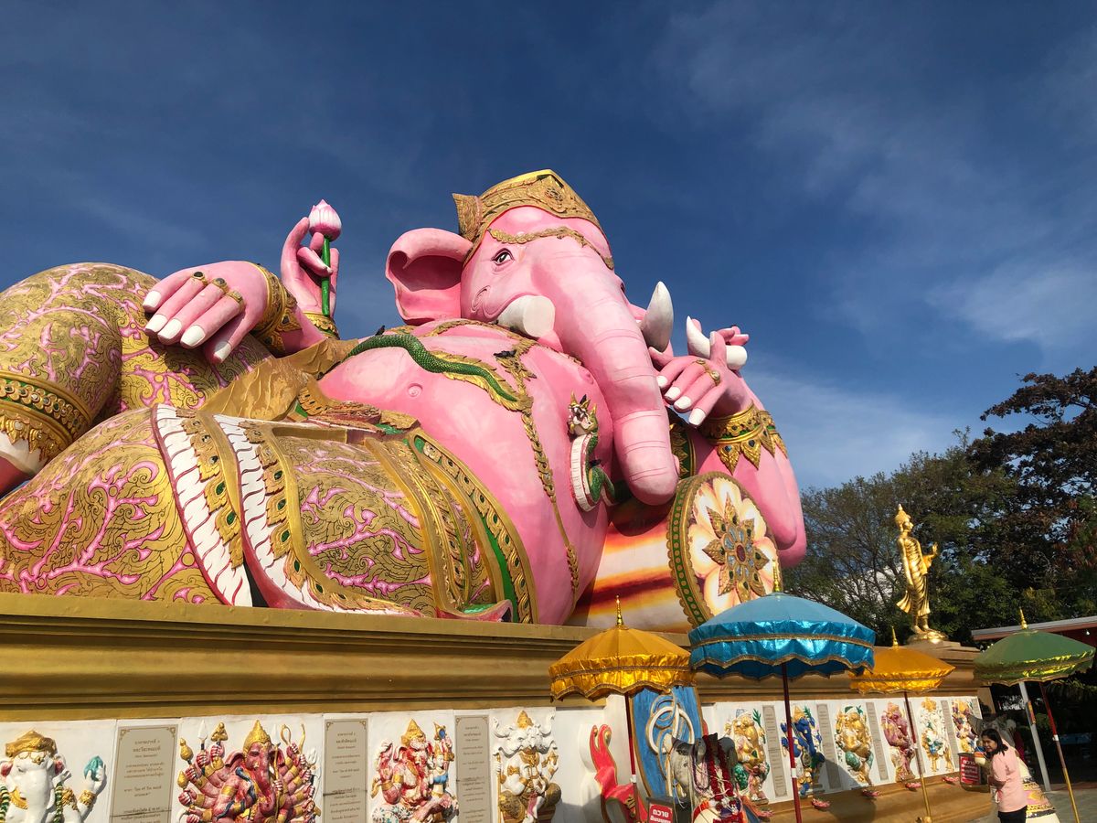 ワットソートンは、立派な寺院で、信仰深いタイの人がたくさん集まっていて、自分の生まれた曜日の仏像に金箔をはり、祈って、興味深くとてもよかったです。ピンクのガネーシャのところは、遊園地のようなところでした。