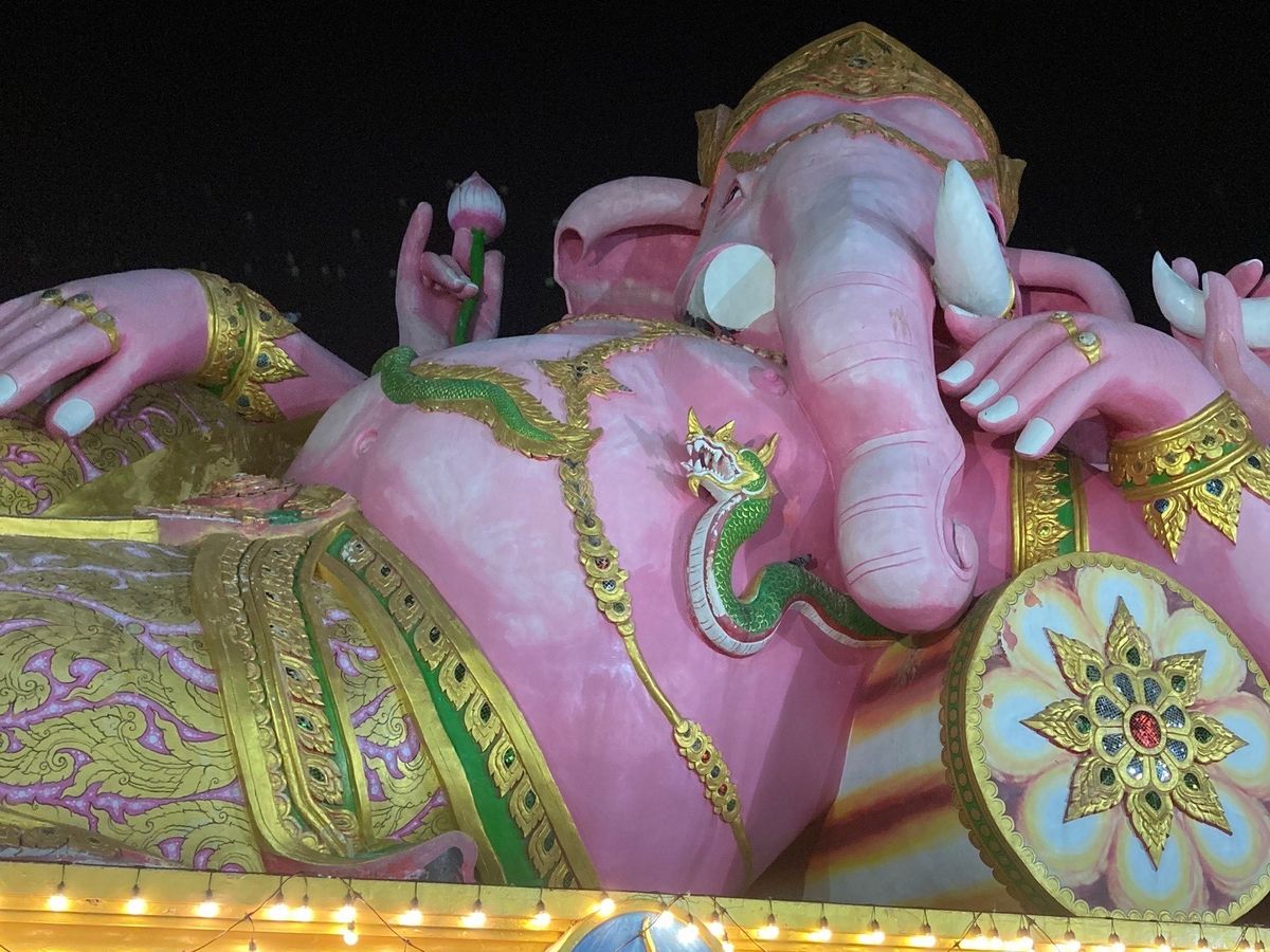 初めてのタイで、いろいろなところを回れました。ワットパクナム(バンコク)→アユタヤ遺跡(2箇所ほど)→ワットマハタート→象乗り→ピンクガネーシャ(カンボジアの近く)→ジョッドフェアナイトマーケットの盛りだくさんツアーでした。年末年始で日曜日だったこともあるのか、渋滞はほとんどなく、19時過ぎにはナイトマーケットに到着できました。