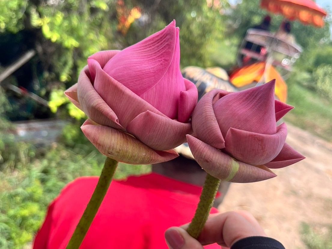 アユタヤ遺跡までは約2時間程の道のり。比較的新しく綺麗な車両でしたので快適な移動でした。アユタヤでの象乗り体験ではプラス料金をお支払して少し長い距離をお散歩しました。水場をお散歩中、蓮の花を上手に鼻でちぎり象使いさんに。それを象使いさんがアレンジし花びらを折り返した可愛い一輪が完成!友人と1本づつプレゼントして頂きました♪またプラス100THBで象さんの鼻で抱っこまでしてもらい、充実した体験となりました。昼食を取り、ピンクのガネーシャを拝観、ナイトマーケットで解散。