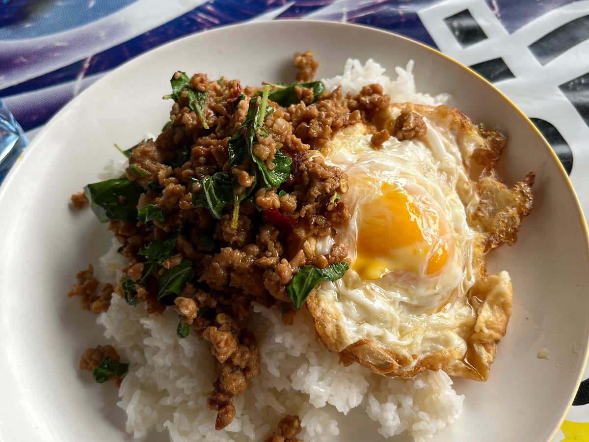 ランチをこの市場でフリーで屋台飯を想像していましたが、ガイドさん紹介の市場の一角の食堂でした。タイのおうちのガパオライスと言った感じで美味しく頂きました。80バーツの自費。