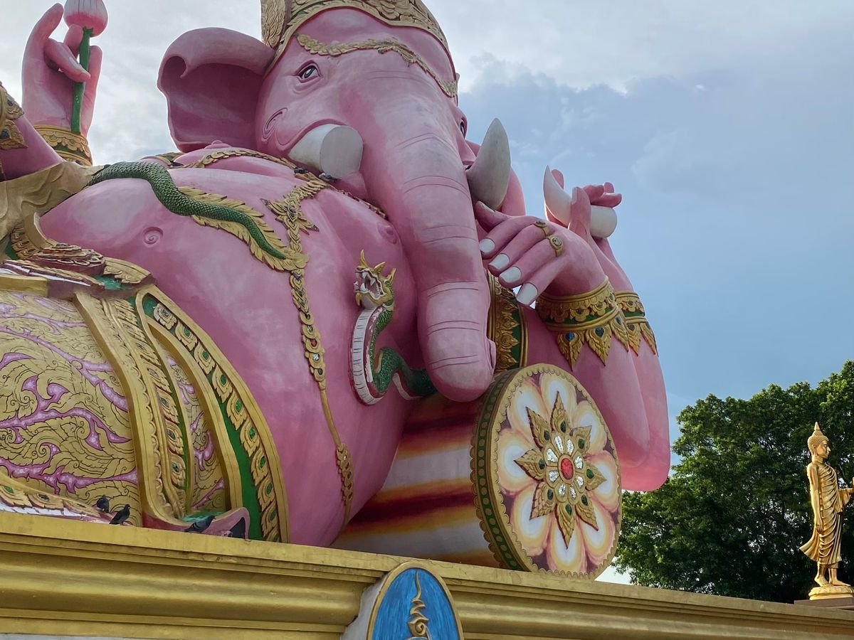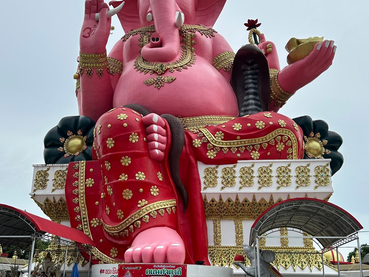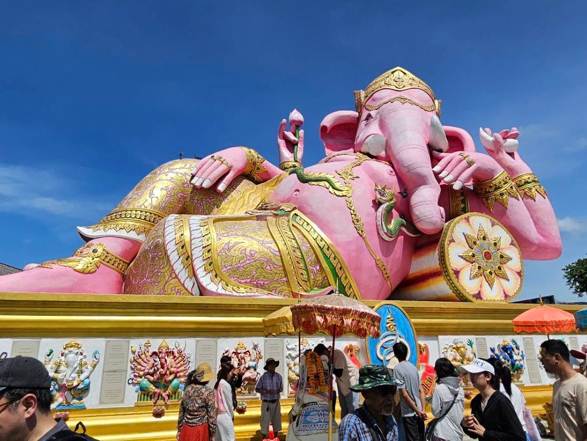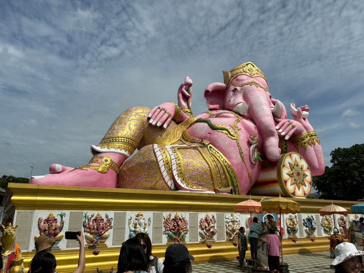 4箇所目の座っているピンクガネーシャは、タイで一番大きな象だそうで大迫力でした。辺り一面田園風景の中に、巨大なガネーシャがどっしりと鎮座している景色が珍しかったです。個人的には、タモ◯さん似のサングラスの仏像様を見つけて、新スポットかもしれないと思いました。