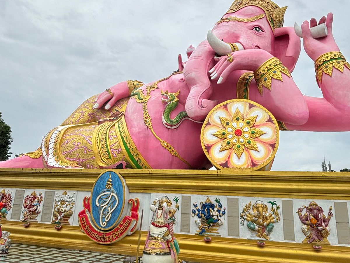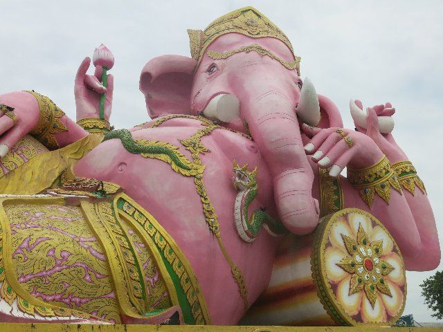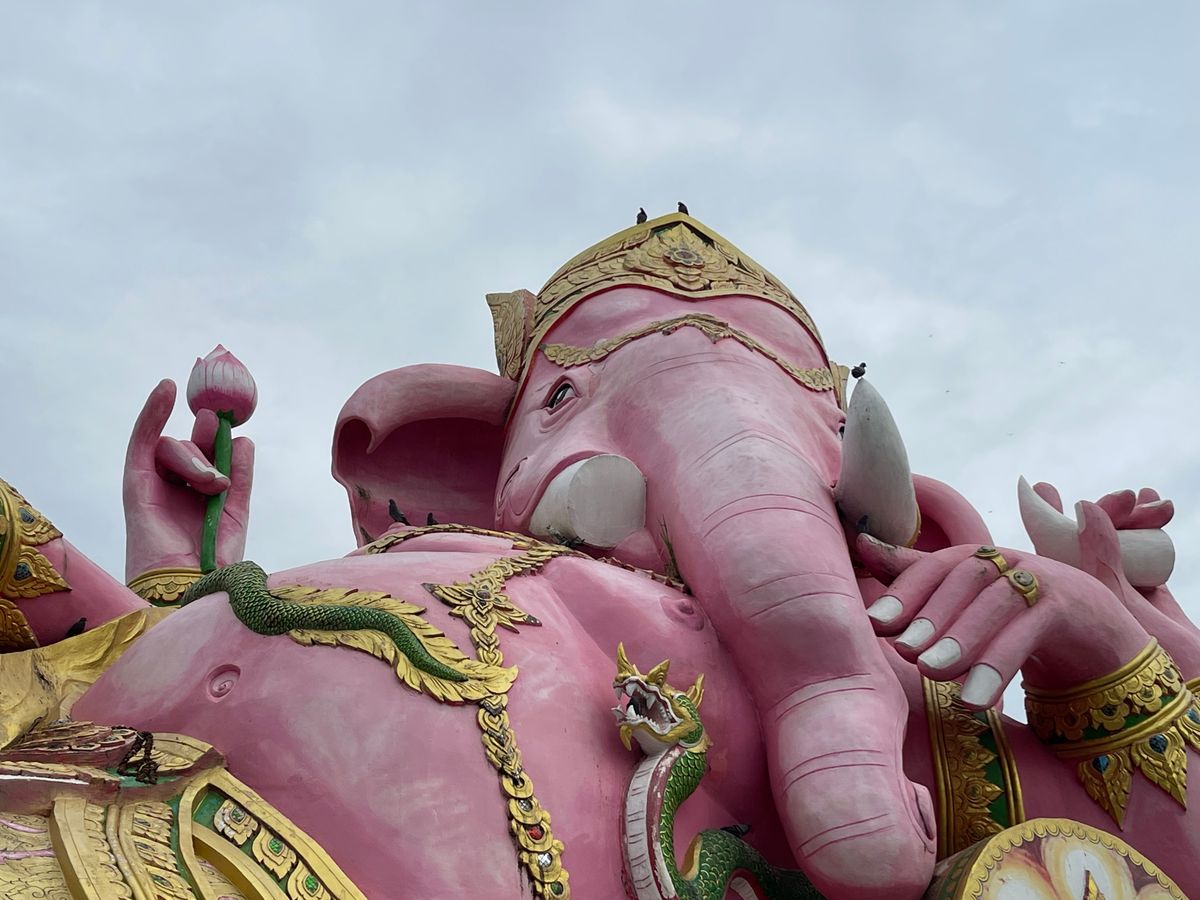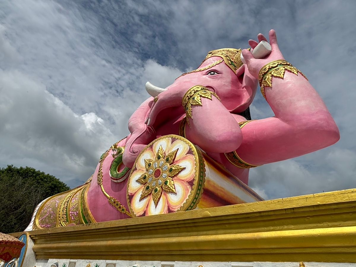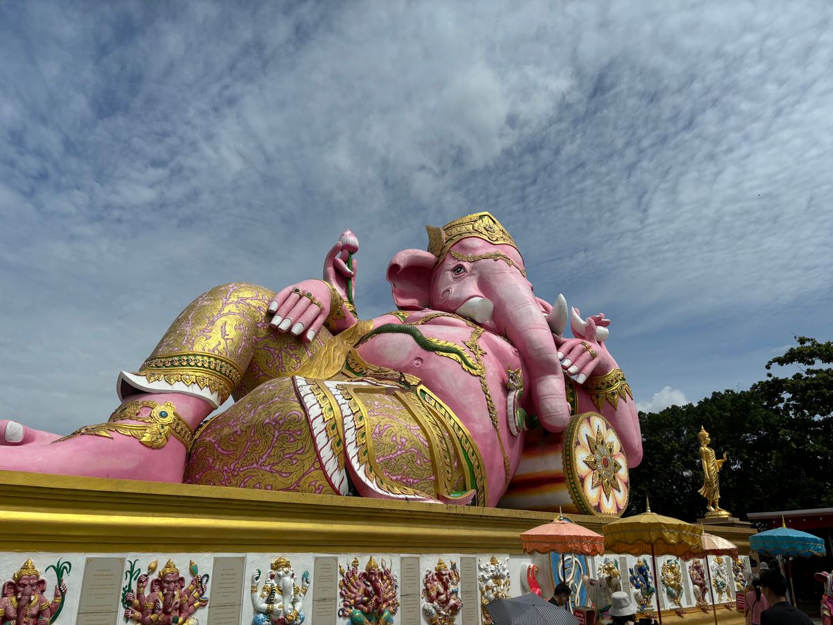 4箇所目の座っているピンクガネーシャは、タイで一番大きな象だそうで大迫力でした。辺り一面田園風景の中に、巨大なガネーシャがどっしりと鎮座している景色が珍しかったです。個人的には、タモ◯さん似のサングラスの仏像様を見つけて、新スポットかもしれないと思いました。