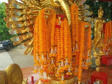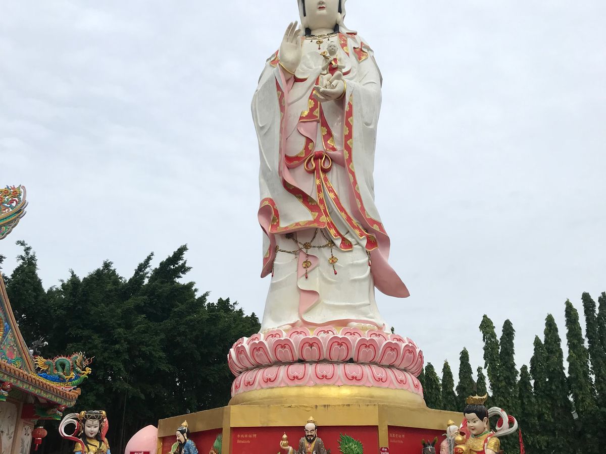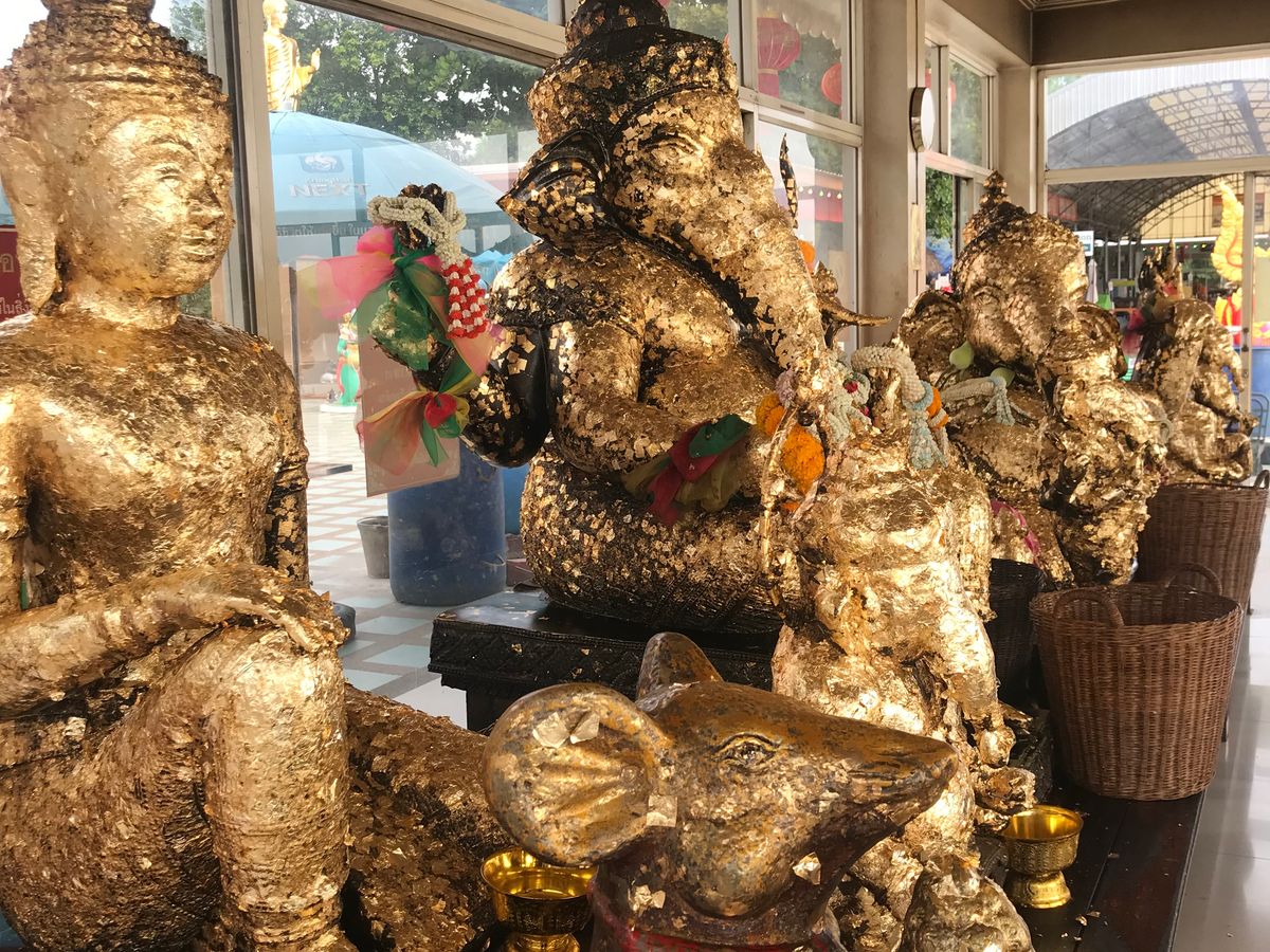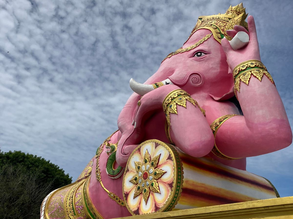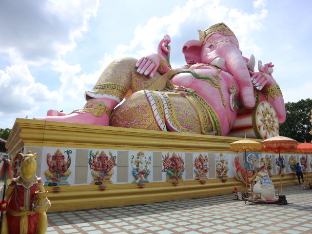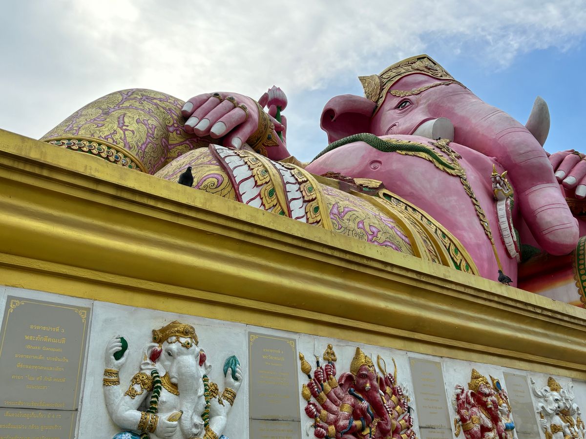 4箇所目の座っているピンクガネーシャは、タイで一番大きな象だそうで大迫力でした。辺り一面田園風景の中に、巨大なガネーシャがどっしりと鎮座している景色が珍しかったです。個人的には、タモ◯さん似のサングラスの仏像様を見つけて、新スポットかもしれないと思いました。
