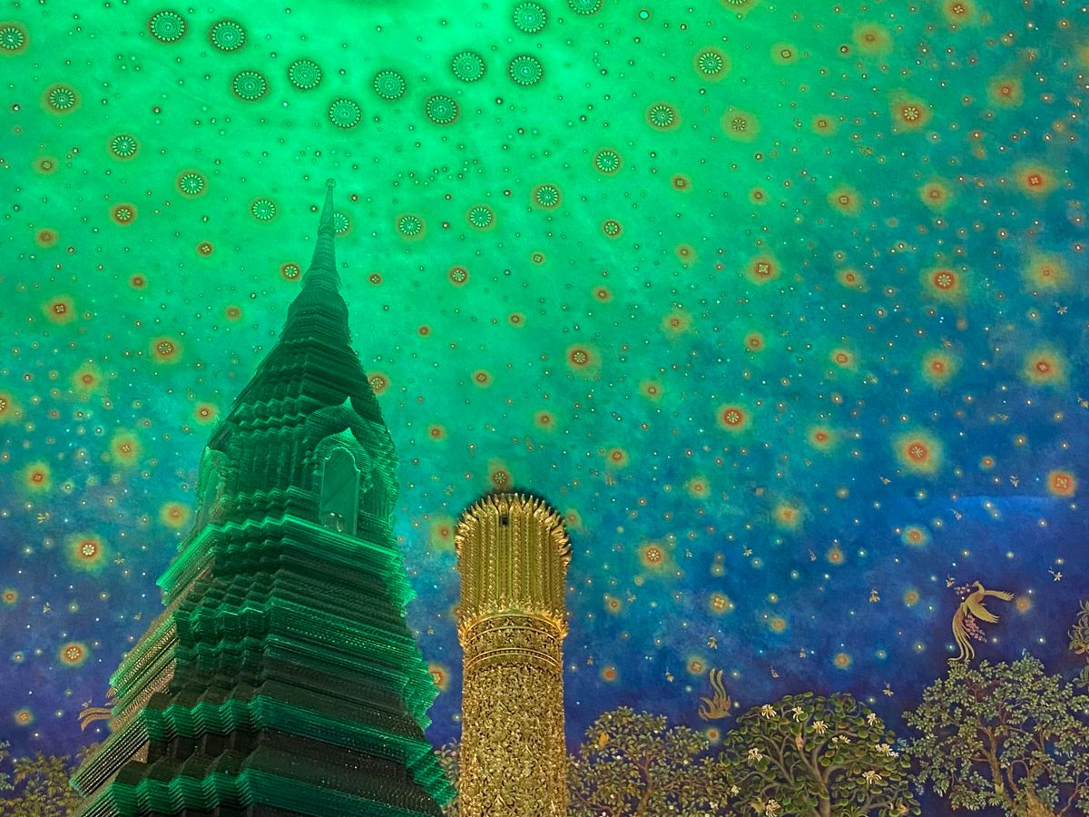 1箇所目のワット・パクナムは、寺院の歴史やコロナ禍でのお話を聞いたり、お目当ての綺麗な天井画と一緒に写真を撮ったりしました。最初に行ったので割と空いていて、人が入らない写真も撮影できました。自由に散策する時間もあり、天井画をたっぷり堪能できました。