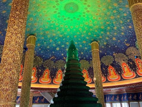 半日で2か所の寺院を訪れた。最初に訪れたのはピンクのガネーシャが祀られているワット・サマーン・ラッタナーラーム寺院である。ガイドの指示に従ってお祈りした。ワット・サマーン・ラッタナーラーム寺院内を巡ると、なぜか中国人風の像を見かけたり、休憩所内には、アニメのキャラクターの像を見かけ異様な感じがした。2か所目はワットパクナムを訪れた。2000年代に入って巨大な仏像や大仏塔が建立され、巨大な建造物に圧倒された。特に大仏塔の最上階にある仏殿図は神秘的に感じた。仏教の宇宙観を表現するために多くの宝飾品が使われていることにも驚いた。いずれも滞在時間は30分程度でゆっくりと寺院内を回れる余裕はなかった。ゆっくりと境内を散策したい方がいれば、別の日に訪れるのもありかと思います。