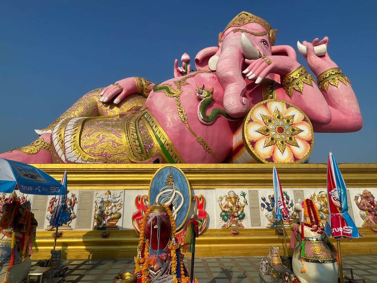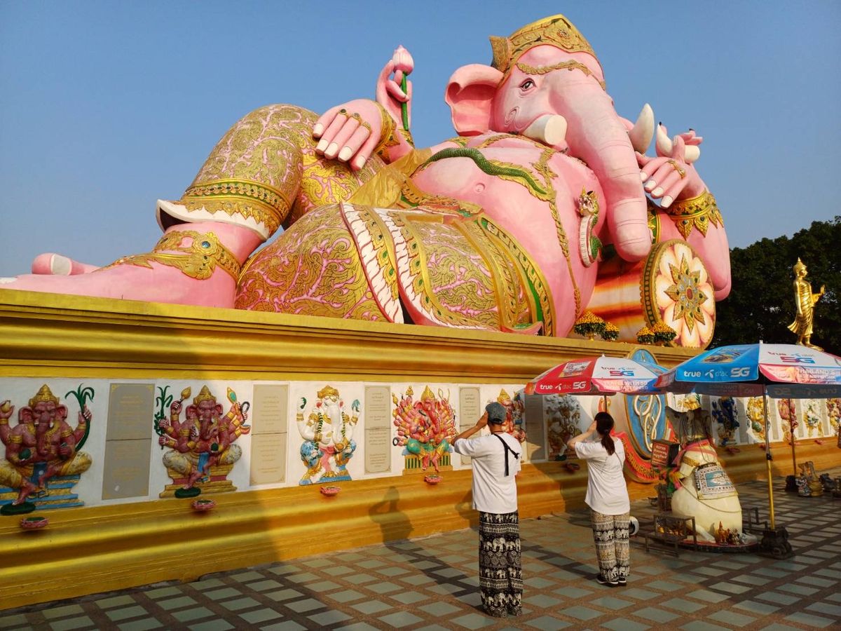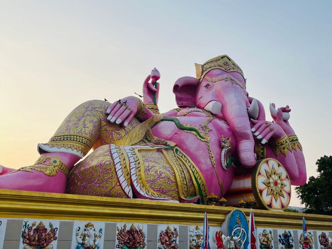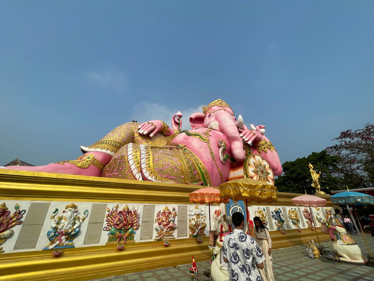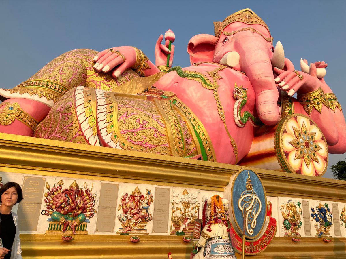 渋滞前に出発できて、お寺に着いてもまだ観光客が集まるには早い時間だったので、人混みにもまれずとてもゆったり見ることができました。お天気がよかったので、青空にピンクガネーシャがよく映えました。ピンクガネーシャの周囲にはヒンズー教や仏教由来の像の他に、なぜか日本でおなじみのマンガやアニメのキャラクターの像も多数あり、なかなかの不思議空間で面白かったです。