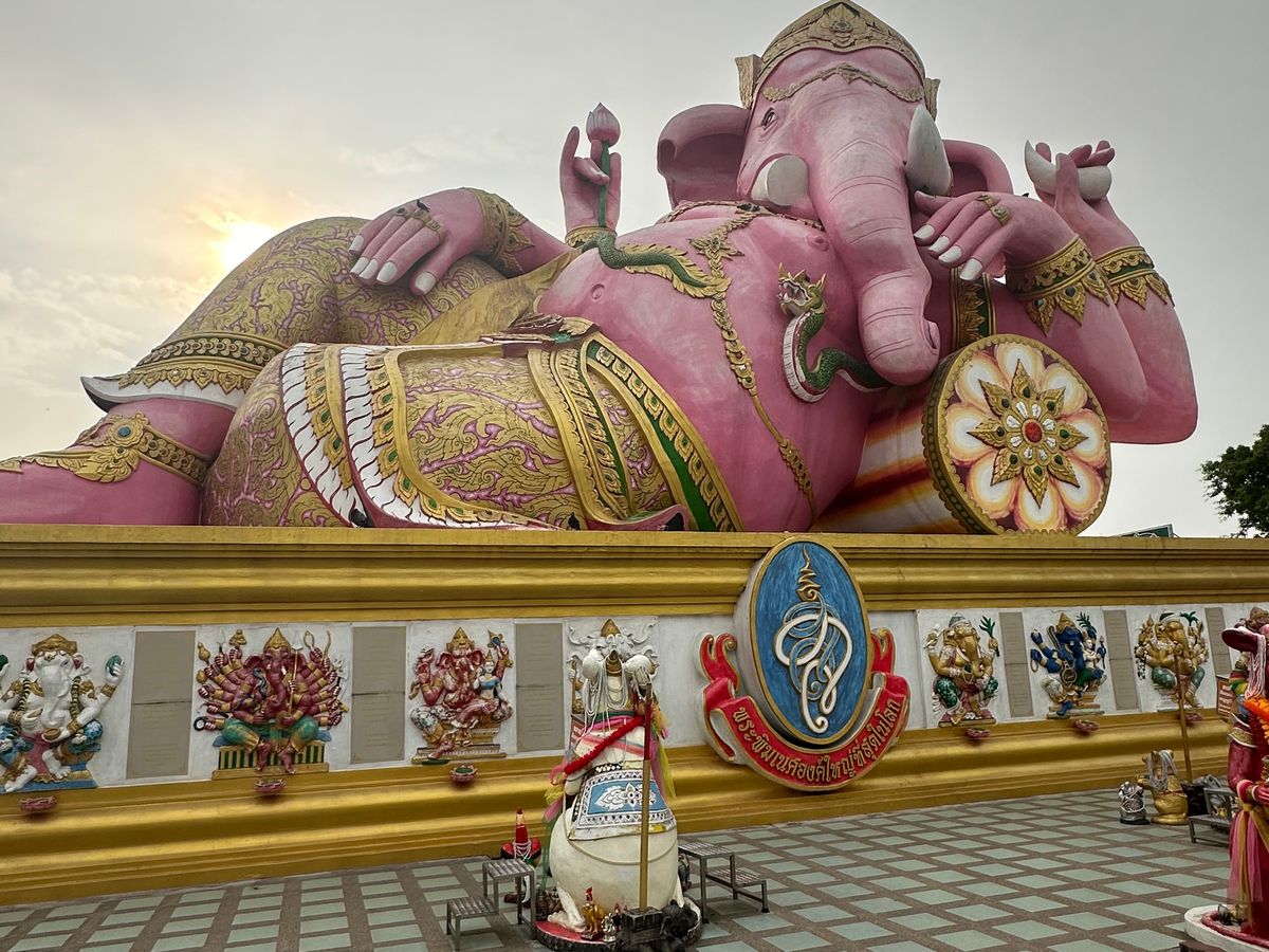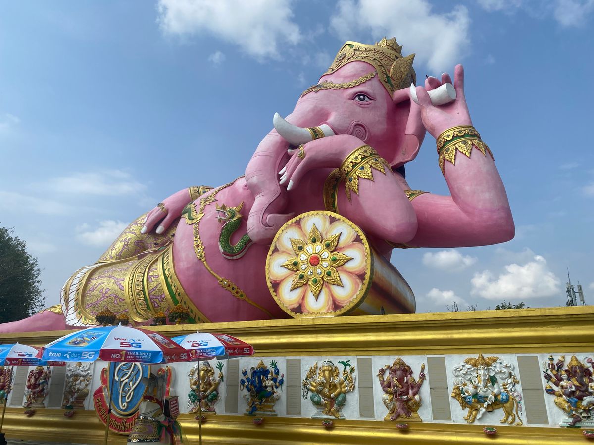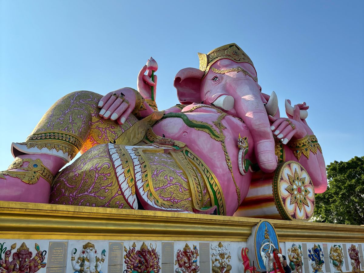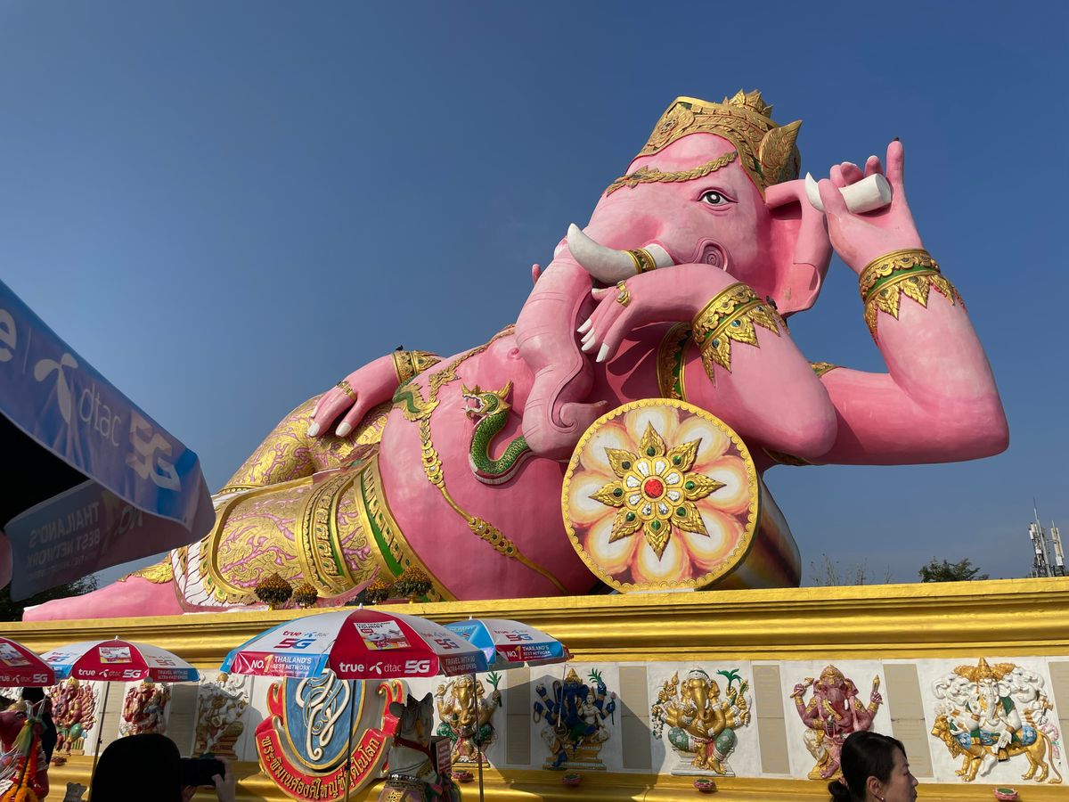 渋滞前に出発できて、お寺に着いてもまだ観光客が集まるには早い時間だったので、人混みにもまれずとてもゆったり見ることができました。お天気がよかったので、青空にピンクガネーシャがよく映えました。ピンクガネーシャの周囲にはヒンズー教や仏教由来の像の他に、なぜか日本でおなじみのマンガやアニメのキャラクターの像も多数あり、なかなかの不思議空間で面白かったです。