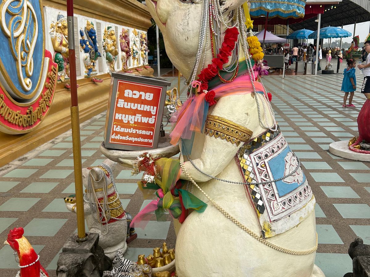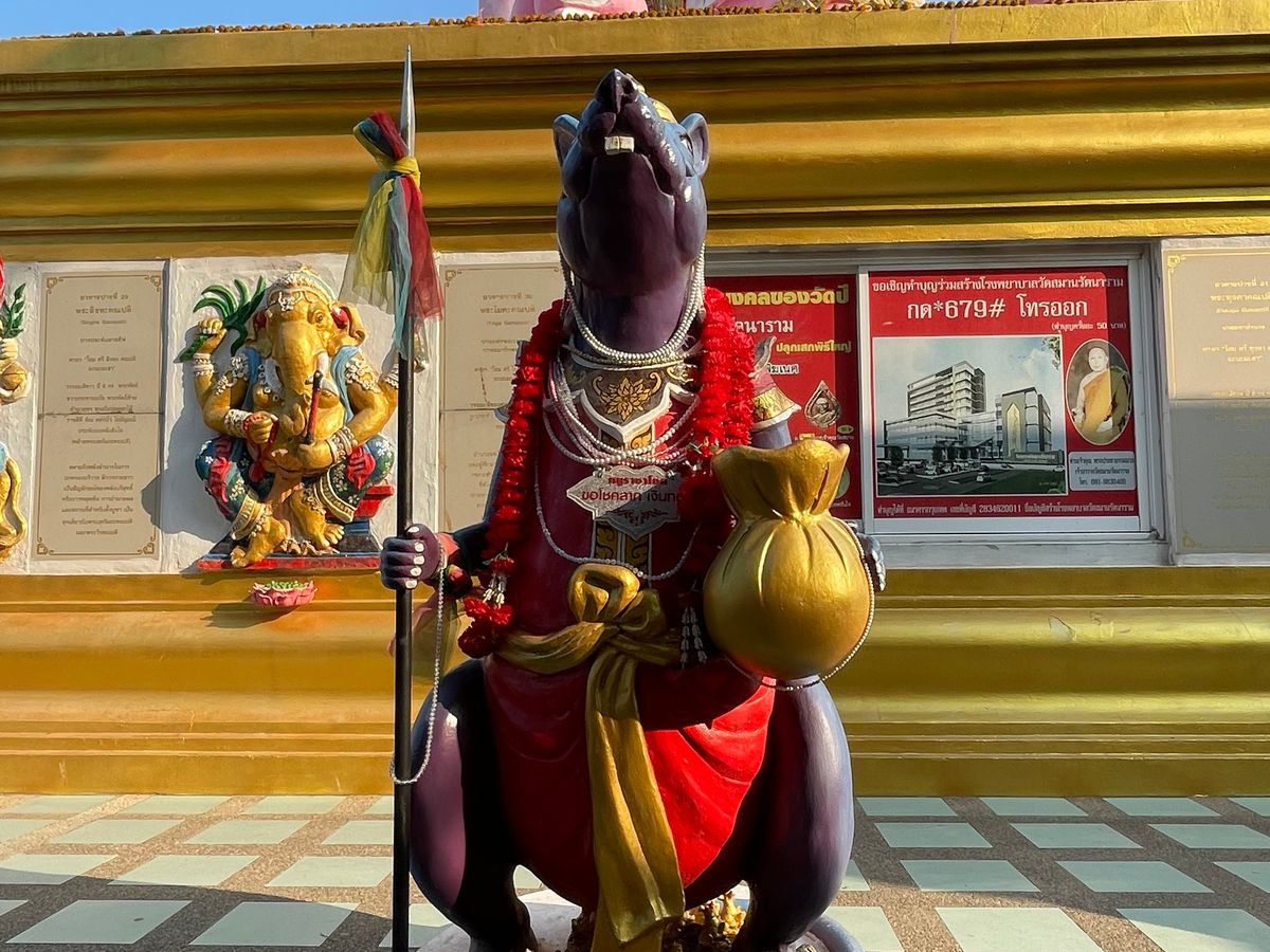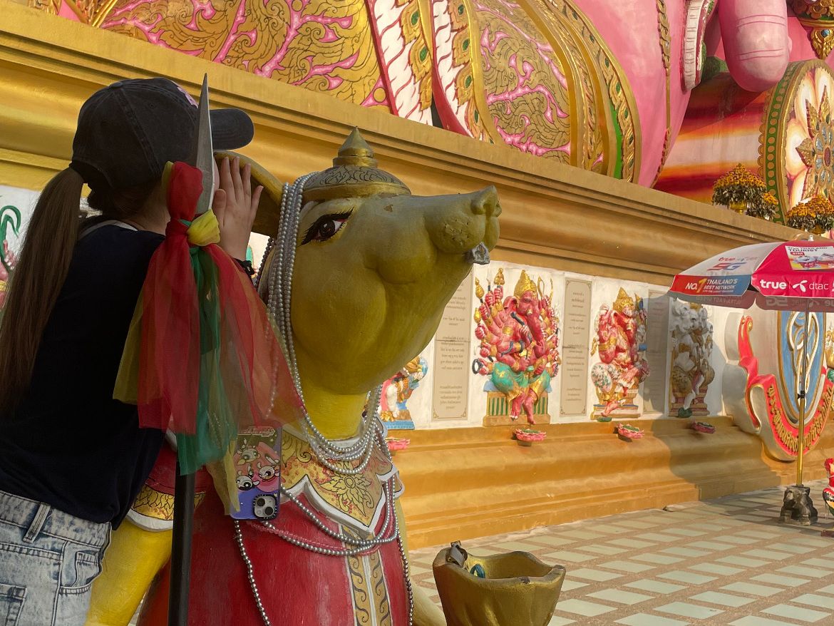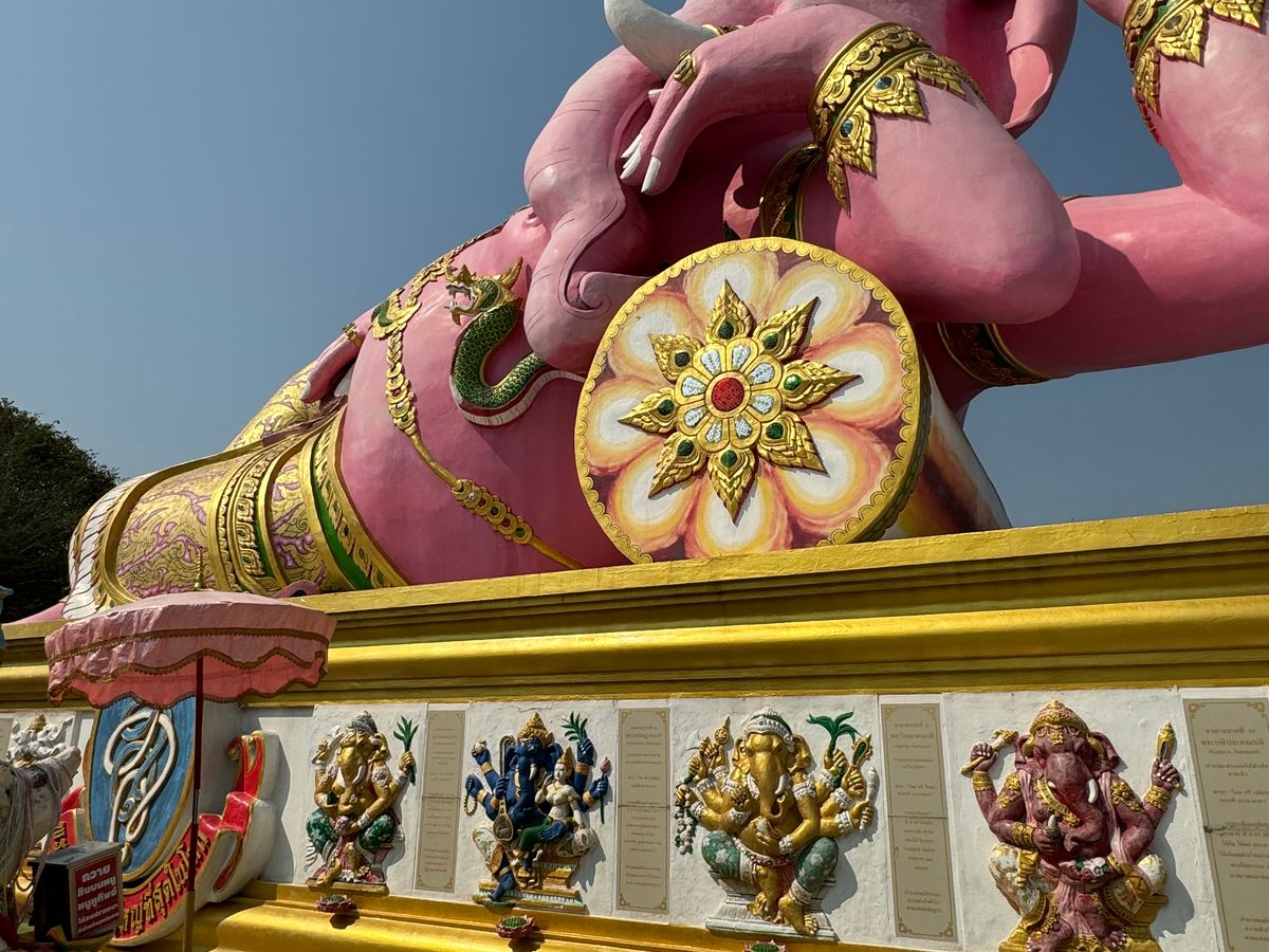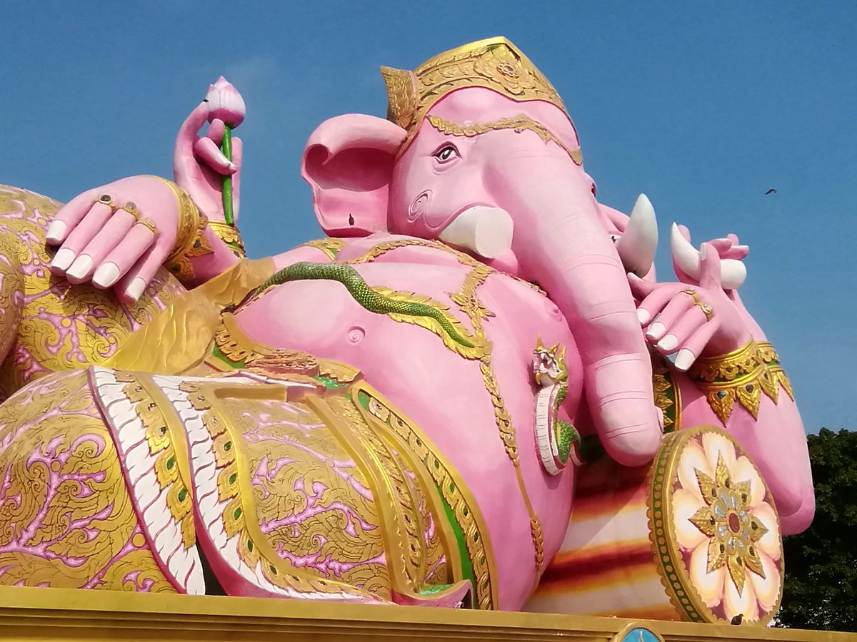 渋滞前に出発できて、お寺に着いてもまだ観光客が集まるには早い時間だったので、人混みにもまれずとてもゆったり見ることができました。お天気がよかったので、青空にピンクガネーシャがよく映えました。ピンクガネーシャの周囲にはヒンズー教や仏教由来の像の他に、なぜか日本でおなじみのマンガやアニメのキャラクターの像も多数あり、なかなかの不思議空間で面白かったです。