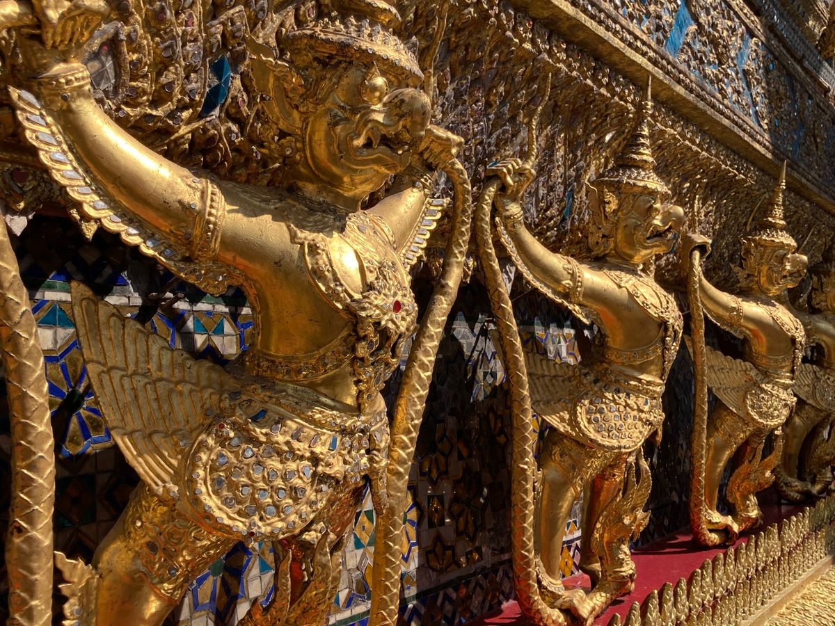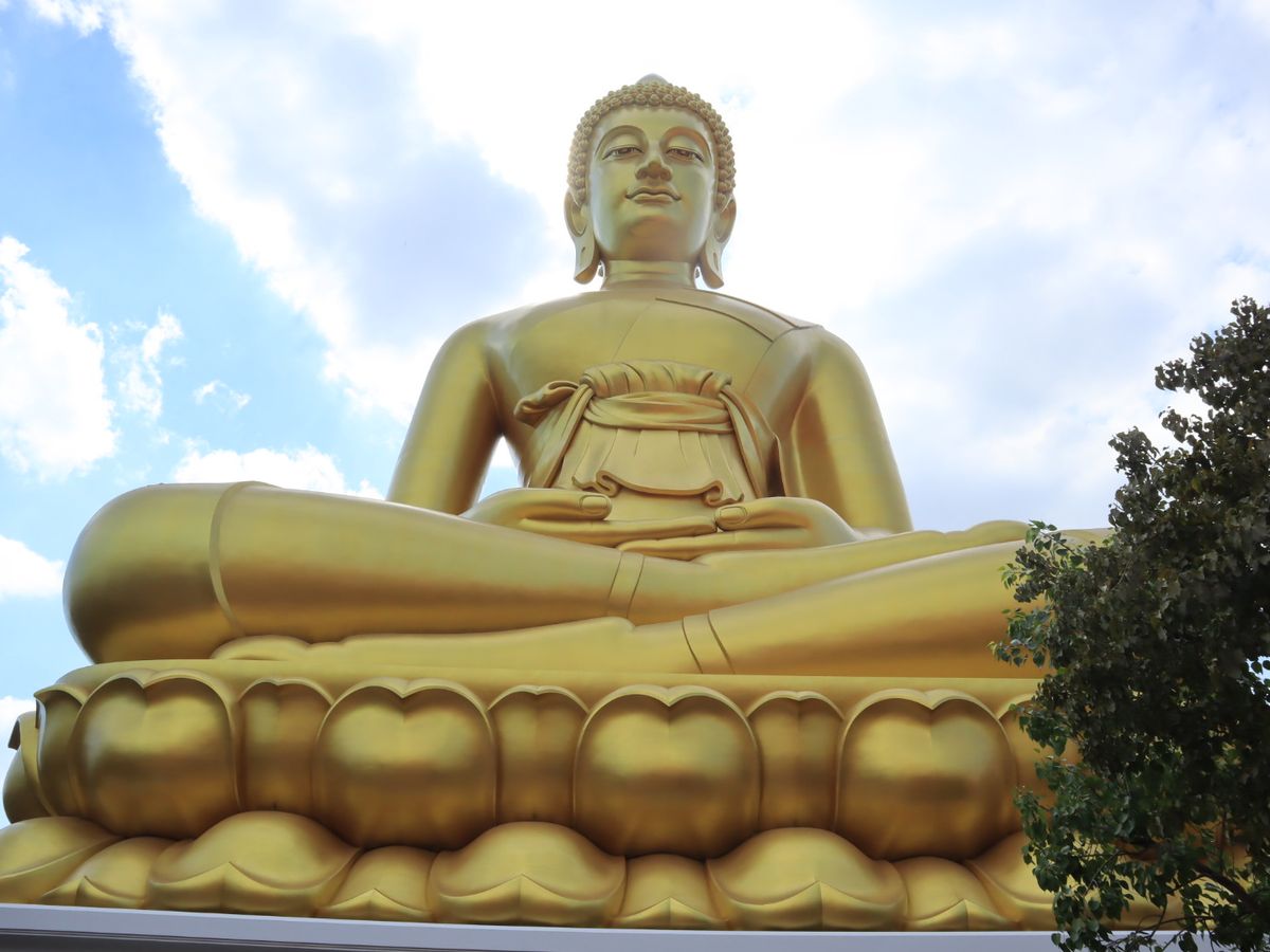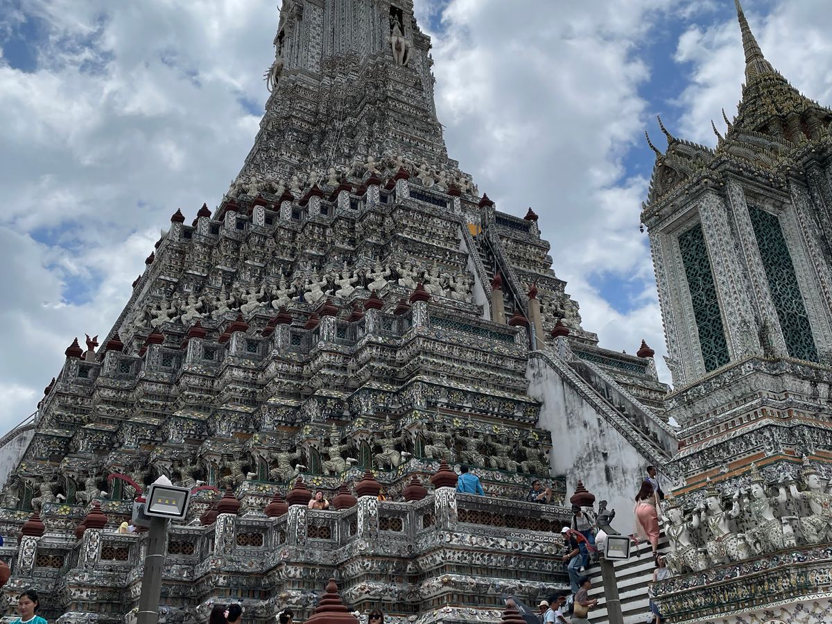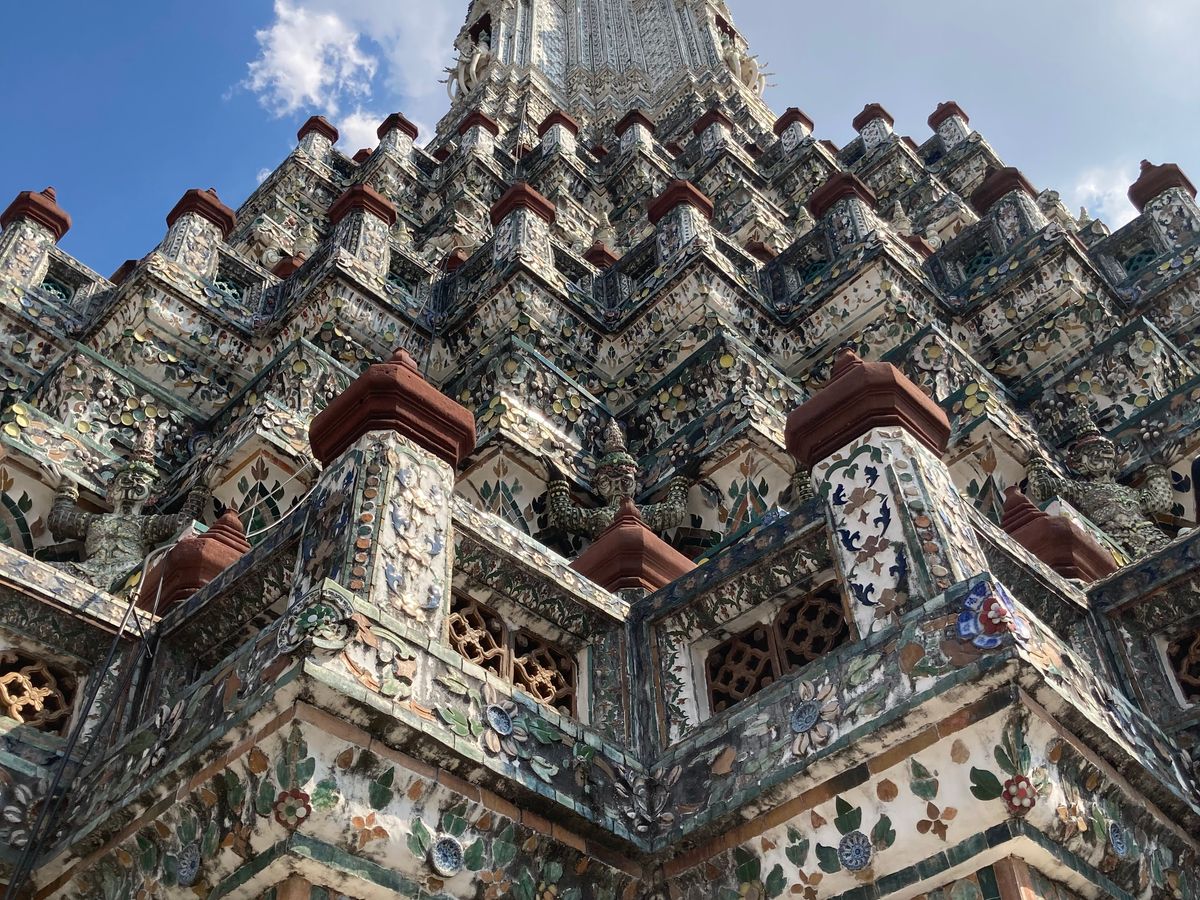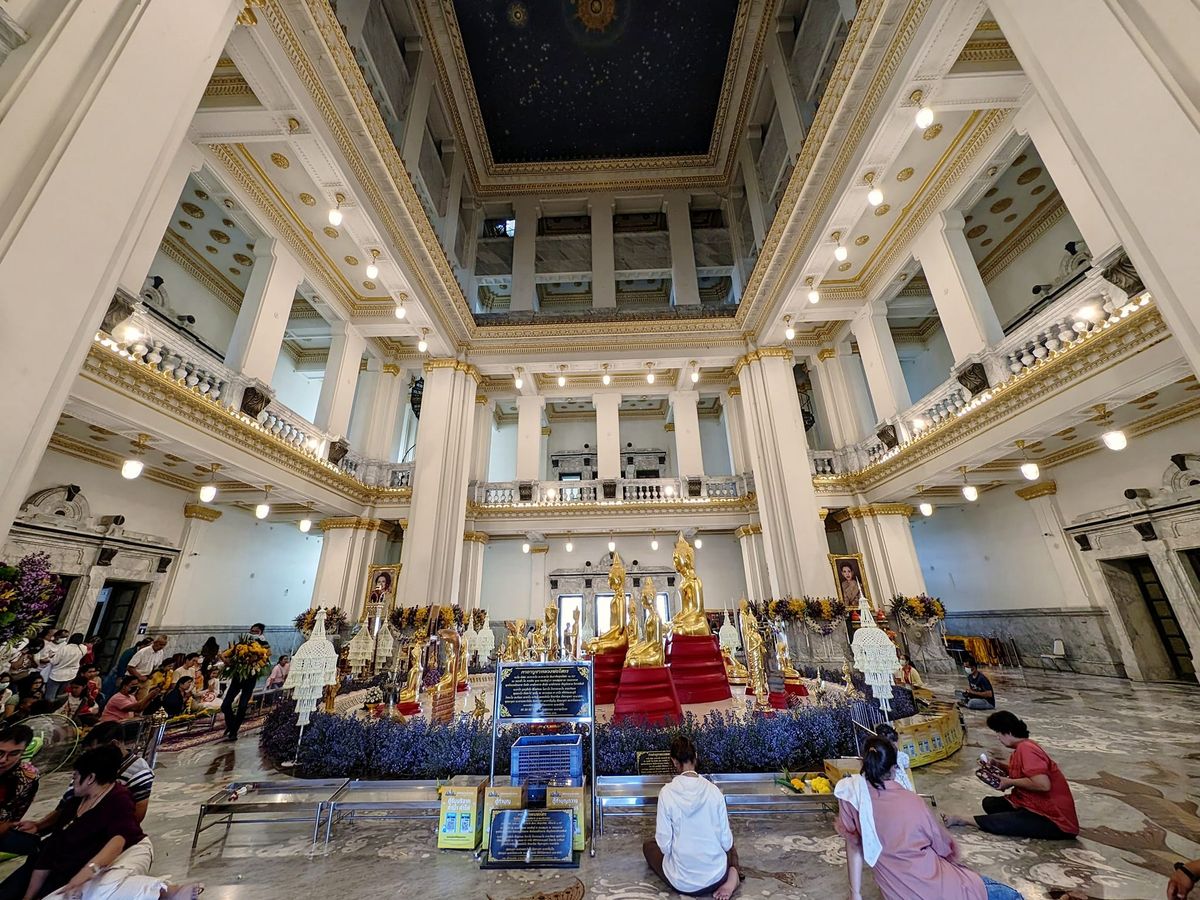 最初に訪れたのは大理石のお寺、ワットソートン。ここでタイのお寺でのお参りの仕方や自分の誕生曜日の色や仏像の説明があり、仏像に金箔を貼ったりもできました。
