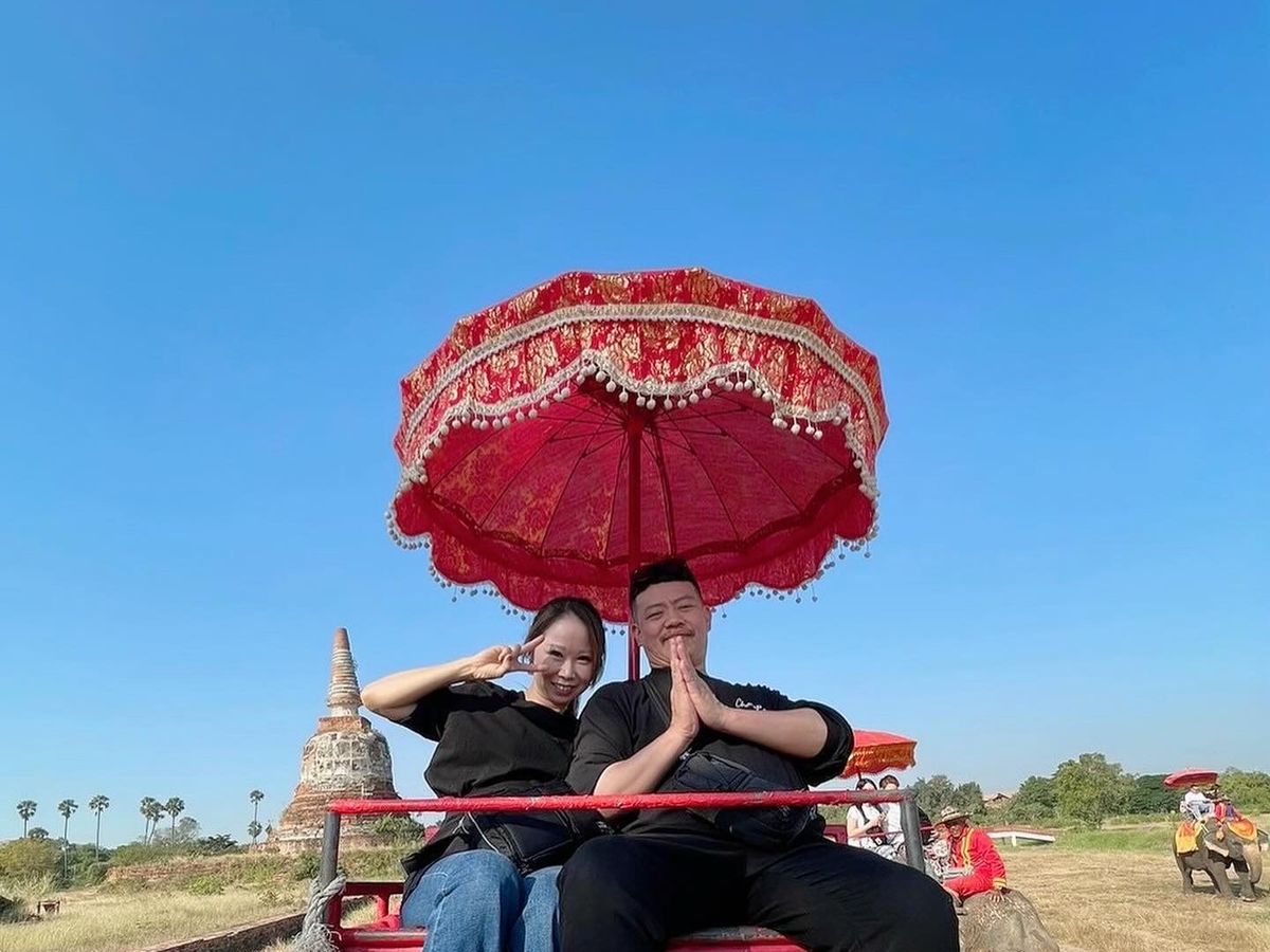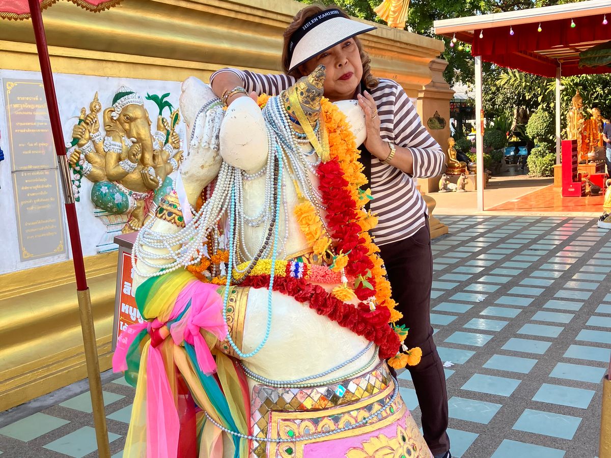 年末旅行の帰国日。14時50分のフライトギリギリまで遊びたく、しかし荷物が重いことを気にしていました。このツアーは、貸切で朝7時にホテルに来てくれ、そのままピンクガネーシャ、ゾウ体験などを行い、スワンナプーム空港へ送ってもらいました。帰国日も遊べて楽できる充実ツアーです。