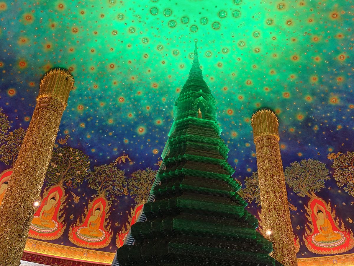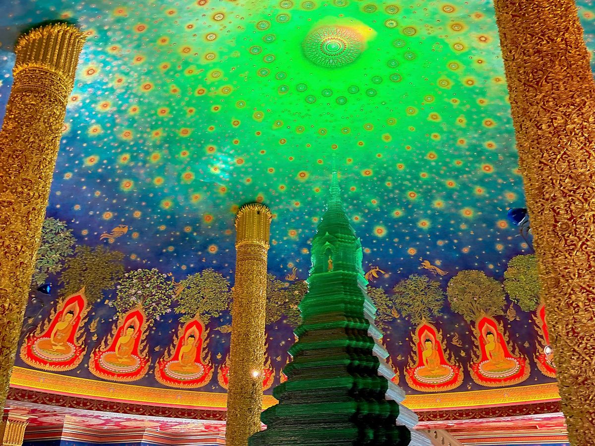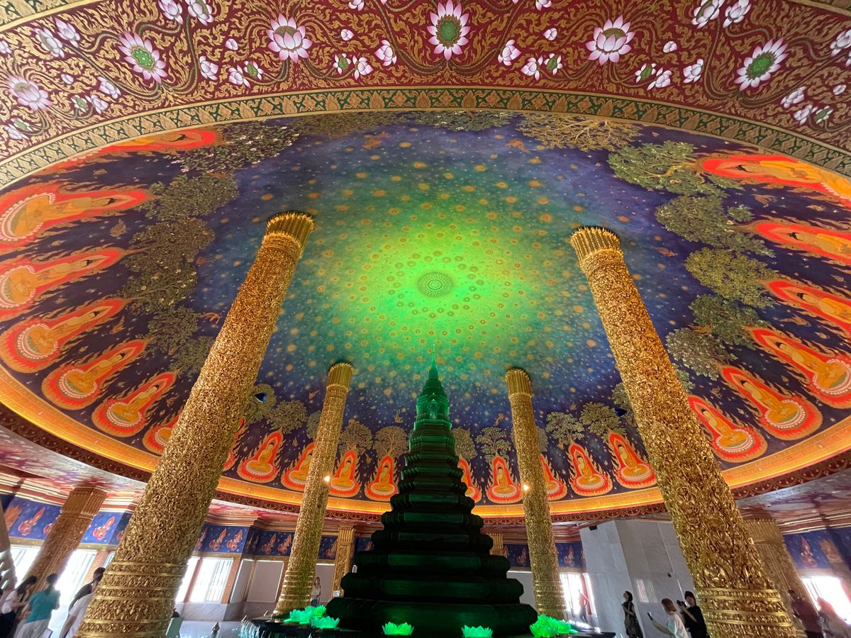 次のワットパクナムは、寺院の中を4階ほど階段で歩いて登りますが、途中階には黄金の仏像などがたくさん美術館のように飾ってあり、見応えはあります。なんといっても、最後階の宇宙観はすごかったですね。ほんと綺麗です!必見です。これは来た甲斐がありました。