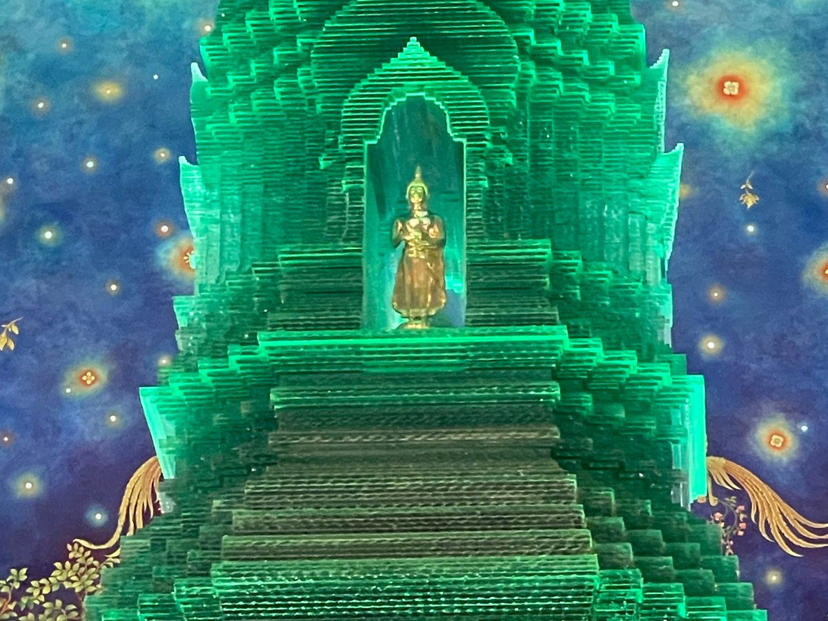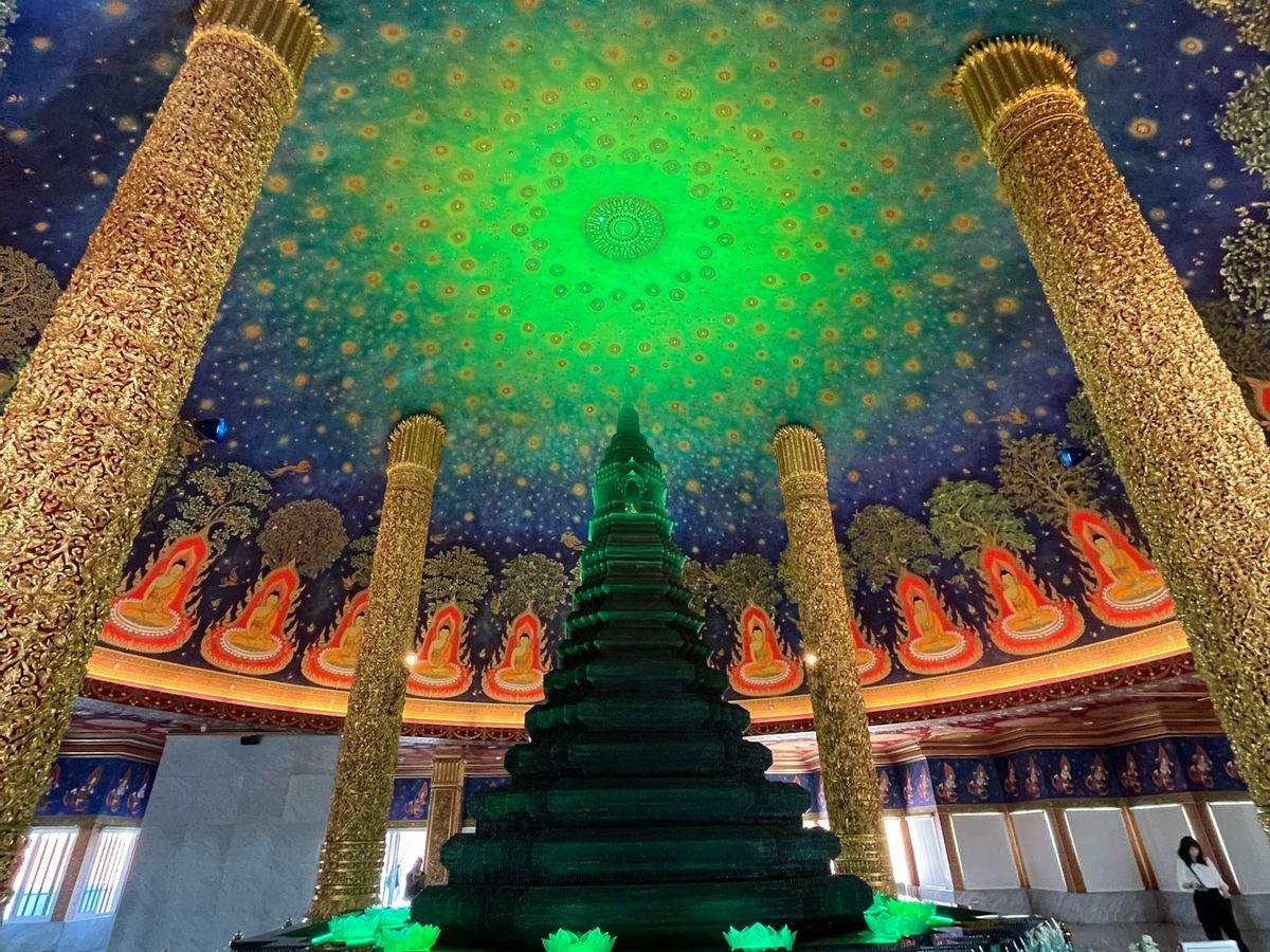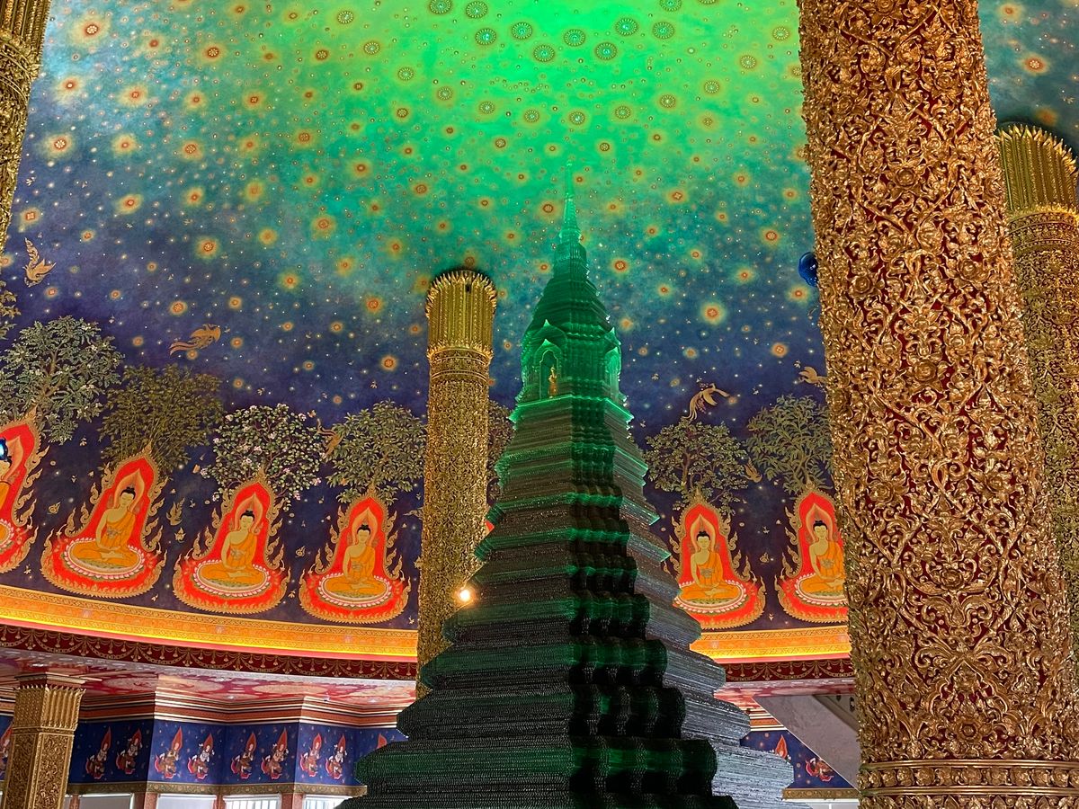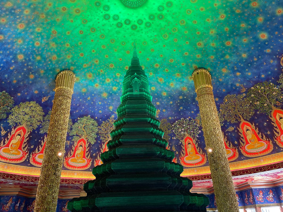 次のワットパクナムは、寺院の中を4階ほど階段で歩いて登りますが、途中階には黄金の仏像などがたくさん美術館のように飾ってあり、見応えはあります。なんといっても、最後階の宇宙観はすごかったですね。ほんと綺麗です!必見です。これは来た甲斐がありました。