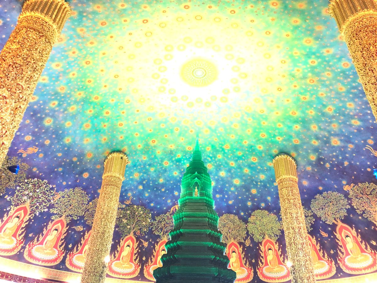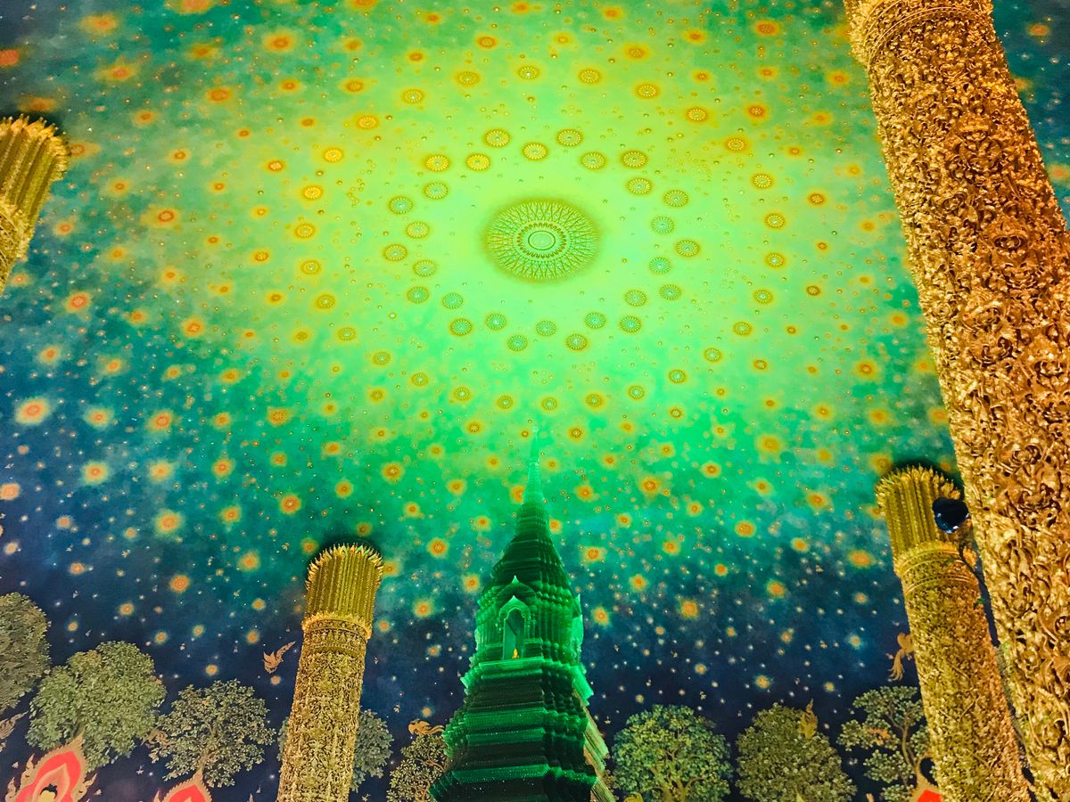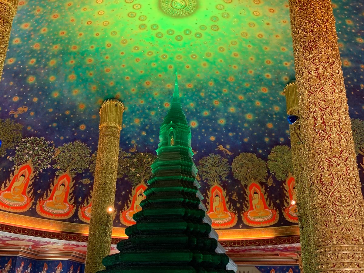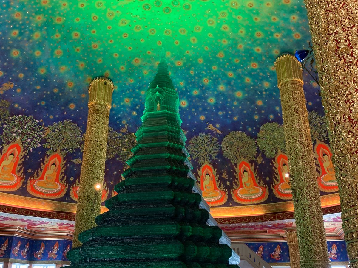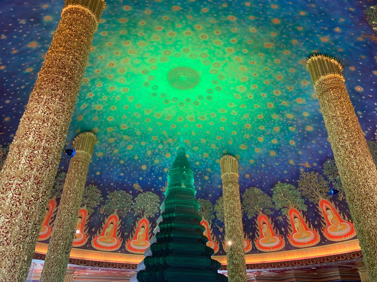 ワットパクナムは、天井がエメラルド色でキラキラしており、見入ってしまいました。あまり人もおらず、ゆっくり見学することができました。