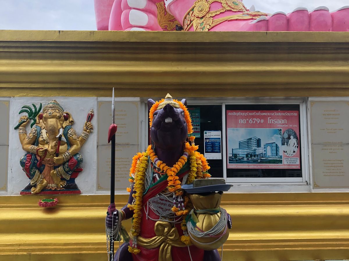 ツアーの最初はピンクガネーシャを見に行きます。バンコクから車で2時間以上かかりました。そこでの滞在時間は25分ほど。次の見学地であるワットパクナムへ移動するとのことなので車に乗り込むと、バンコクに戻ると聞いて唖然…。この25分のために往復4時間以上かぁ…とヘコみました。