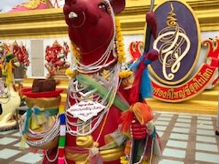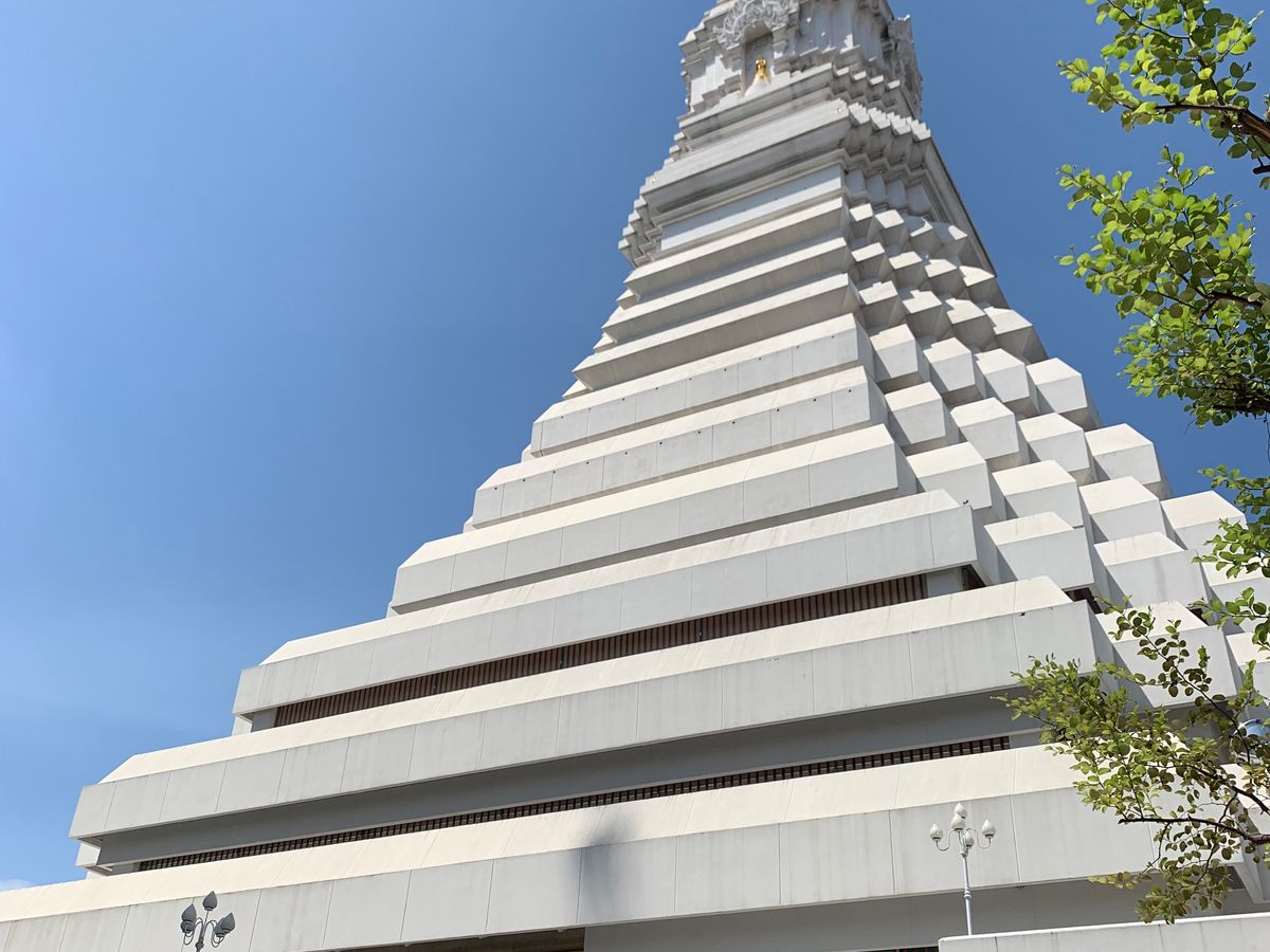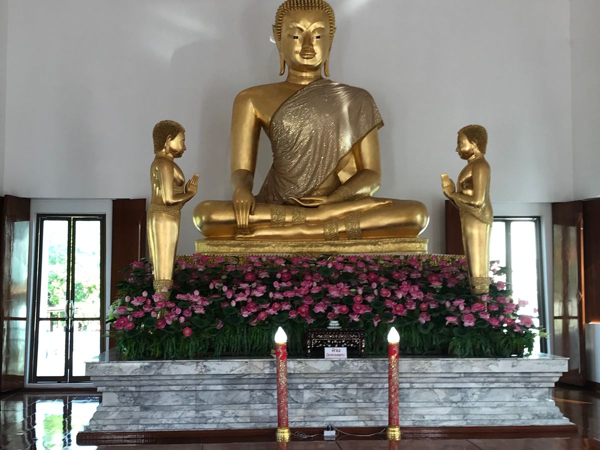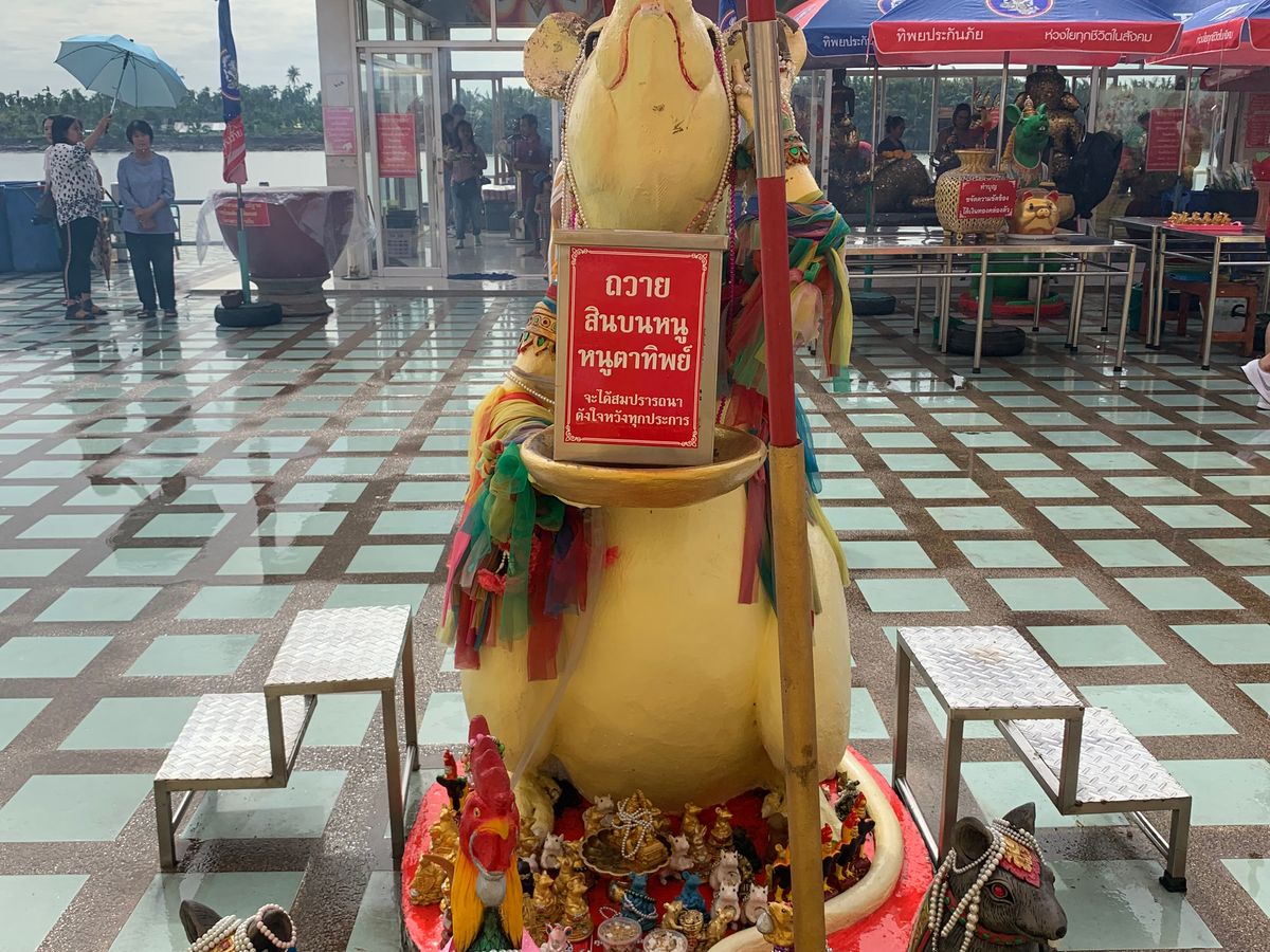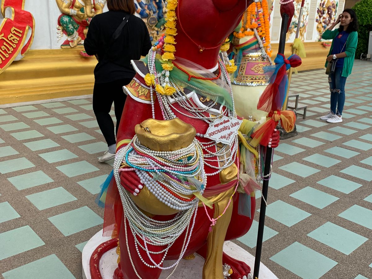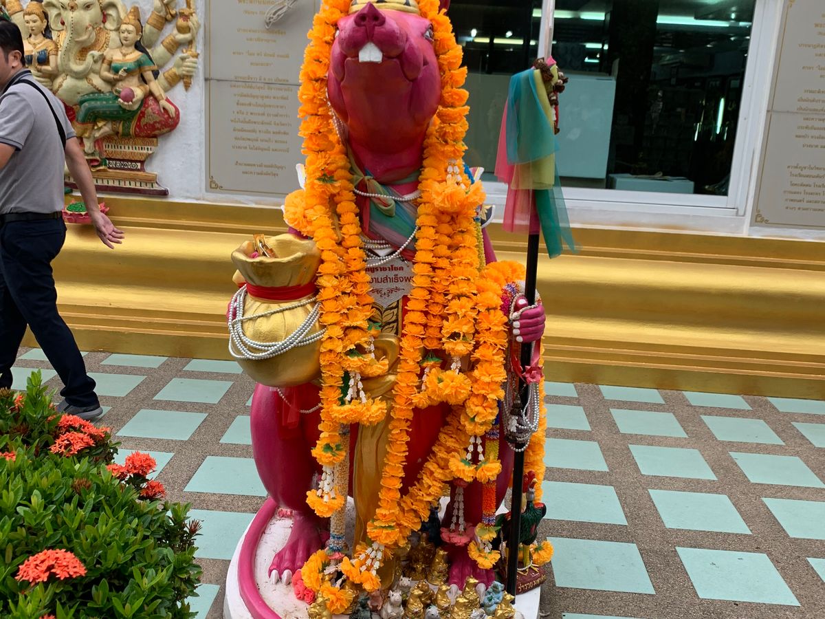 。不安だった気持ちかが、ホッとしました。しばらくすると担当の添乗員さんが現れバウチャーを見せ出発しました。朝は早かったので、朝食がバイキングでしたので間に合わなかったのて、サンドイッチやパンなどボックスに詰めて貰えるようホテルには事前にお願いしておきました。もう1組違うホテルでピックアップがありましたが女の子2名で、計4名で出発しました。道のりはとても遠いのは知っていたので、眠りながらも行けたのは良かったです。添乗員さんも色々と周りの景色について説明して下さり、あっという間に念願のピンクガネーシャにつきました。朝8時前には到着したので、人はあまりいませんでした。写真とったりお願い事したりしていたら、沢山の観光客が来たので、早めに着けて良かったと思いました!みなさんも早めにの方がゆっくり人が入らず写真取れたりお願い出来ますよ。 着いてからきちんと添乗員さんが説明してくれました。お参り方法や、誕生日の曜日のネズミさんなど、日本ではあまり誕生日の曜日は気にしないと思いますが、バンコクでは生まれた曜日で色が決まっているそうです。私は分からなかったのですが、調べたら火曜産まれで、色はピンクでした。大好きな色で嬉しかったので、そのネズミさんにもお願いしてきました!次に向かったのはワットパクナムです。また車で1時間半?くらいでしょうか、寝てたのでそんなに時間気になりませんでしたが、到着。中までは行けないようで、細い賑わった道で素早く降りました。そこから歩いて5.6分位の所にワットパクナムがありました。真っ白の寺院でとても素敵でした。下の方は色々と博物館のようになっているようでした。まずは、エレベーターで1番上のインスタ映スポットへ。٩(ˊᗜˋ*)و