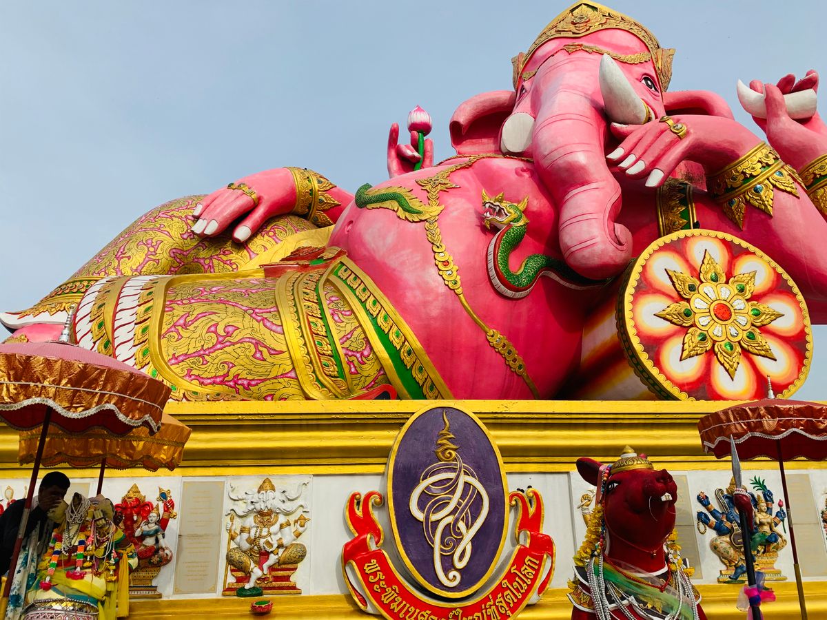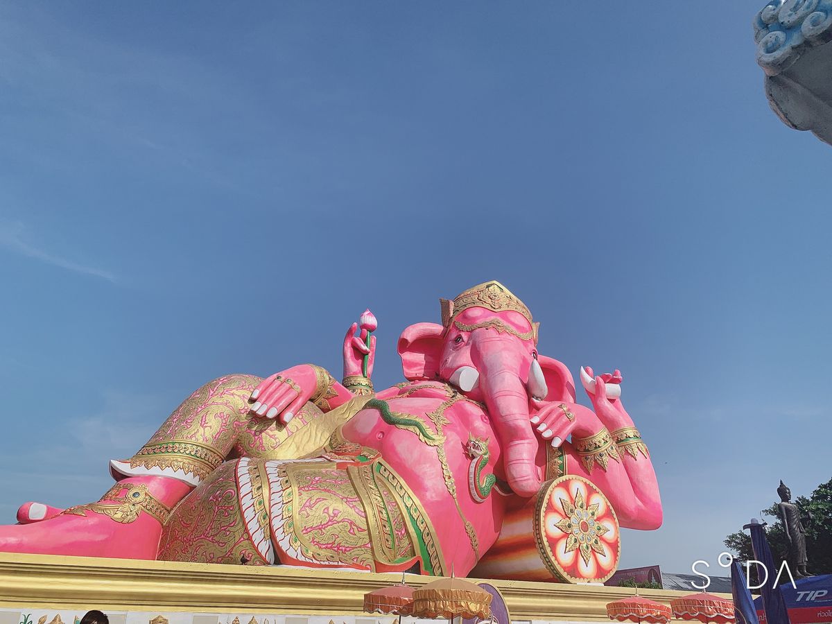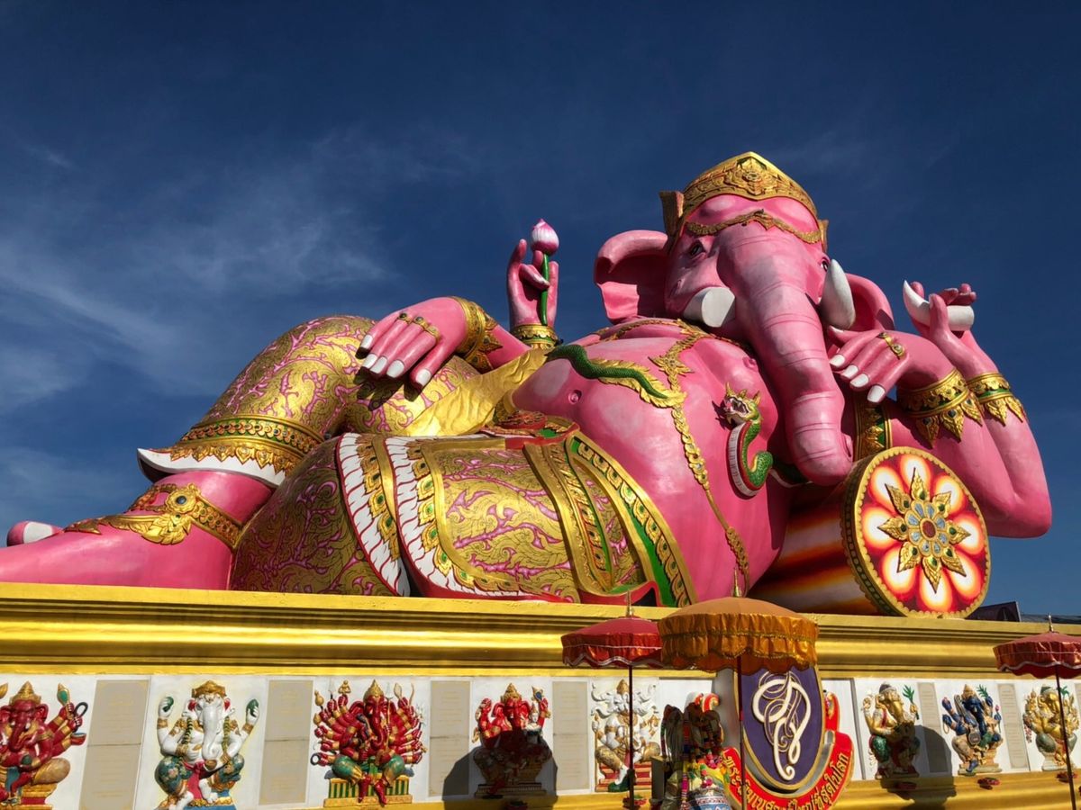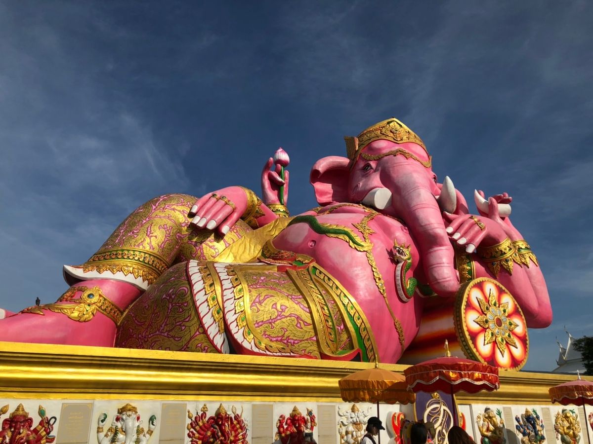 ピンクのガネーシャは、色鮮やかで、青い空に映えていました。