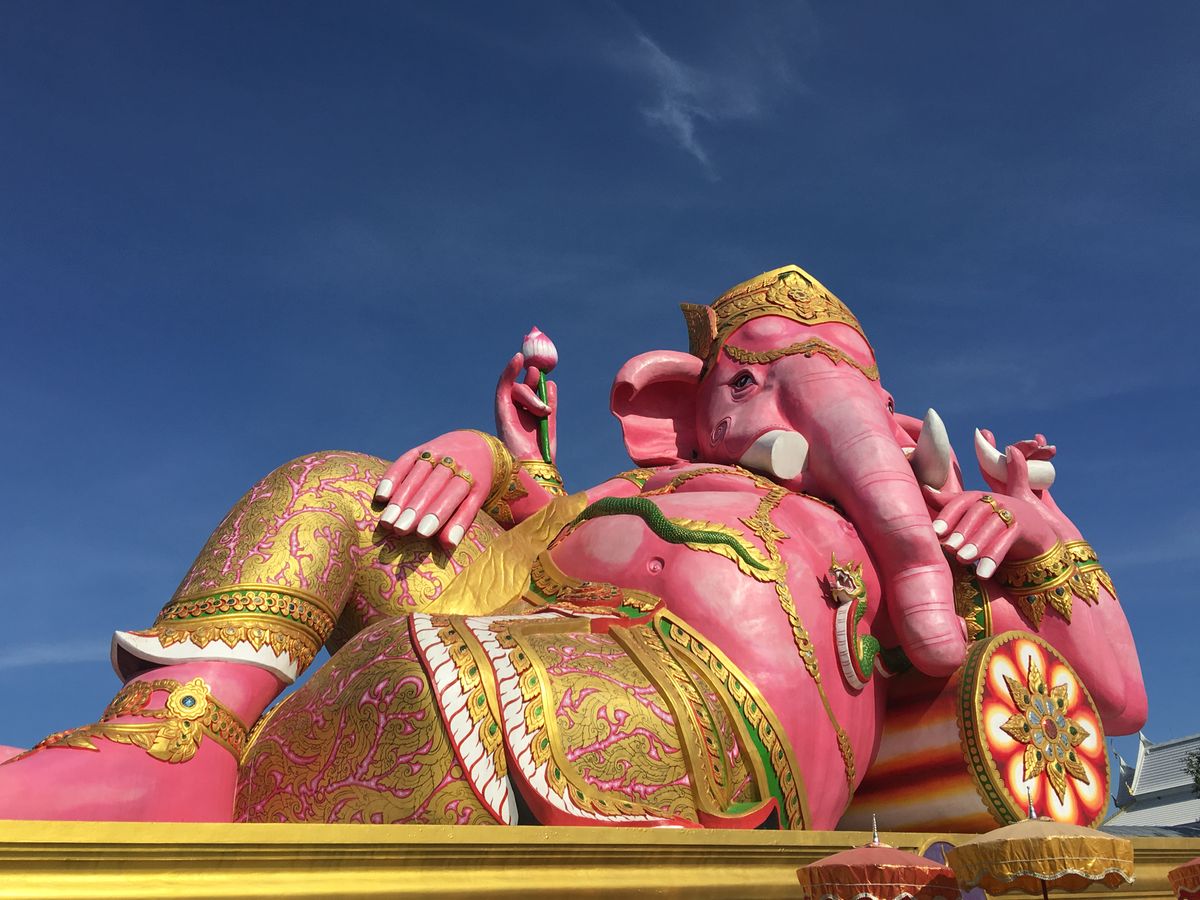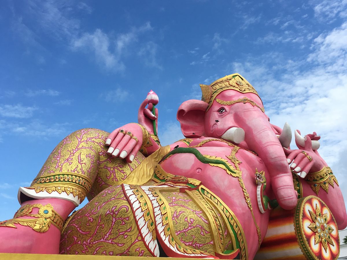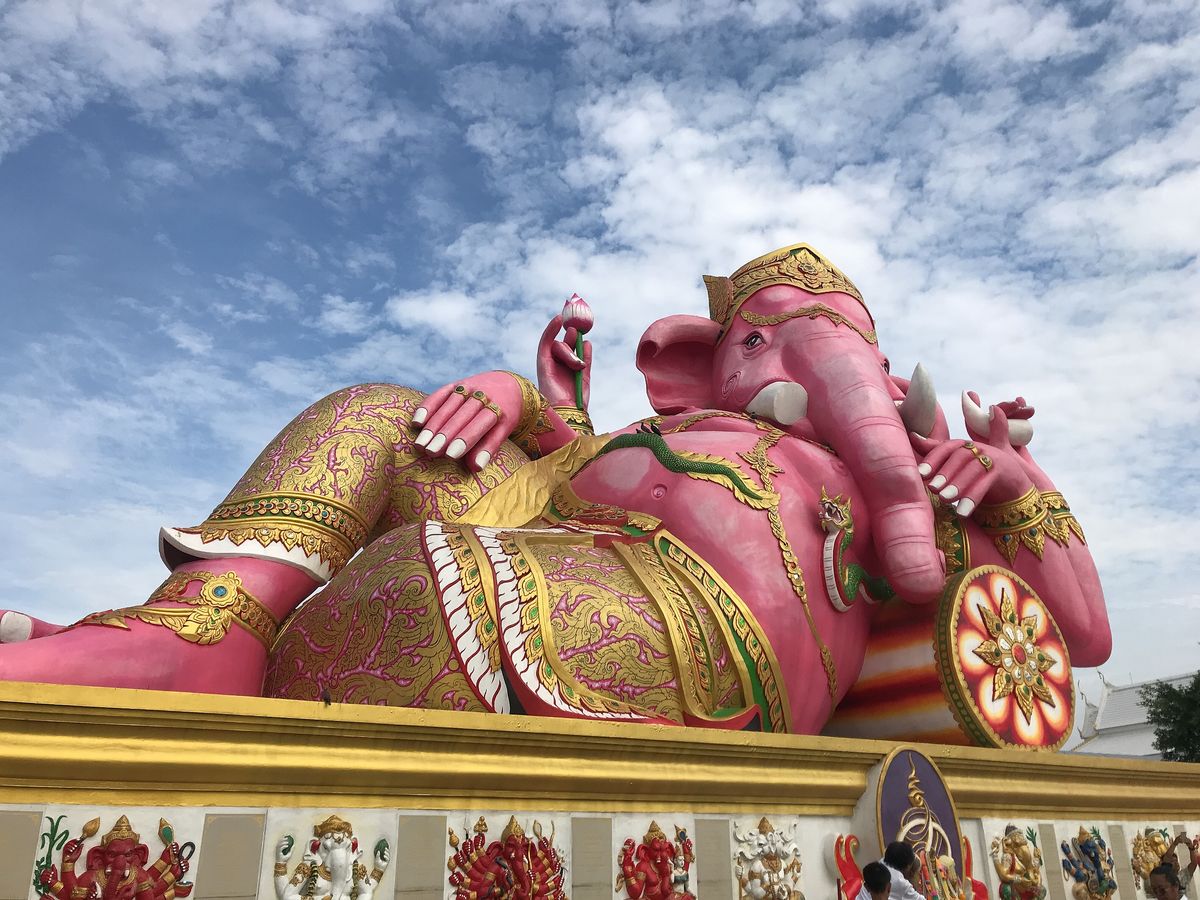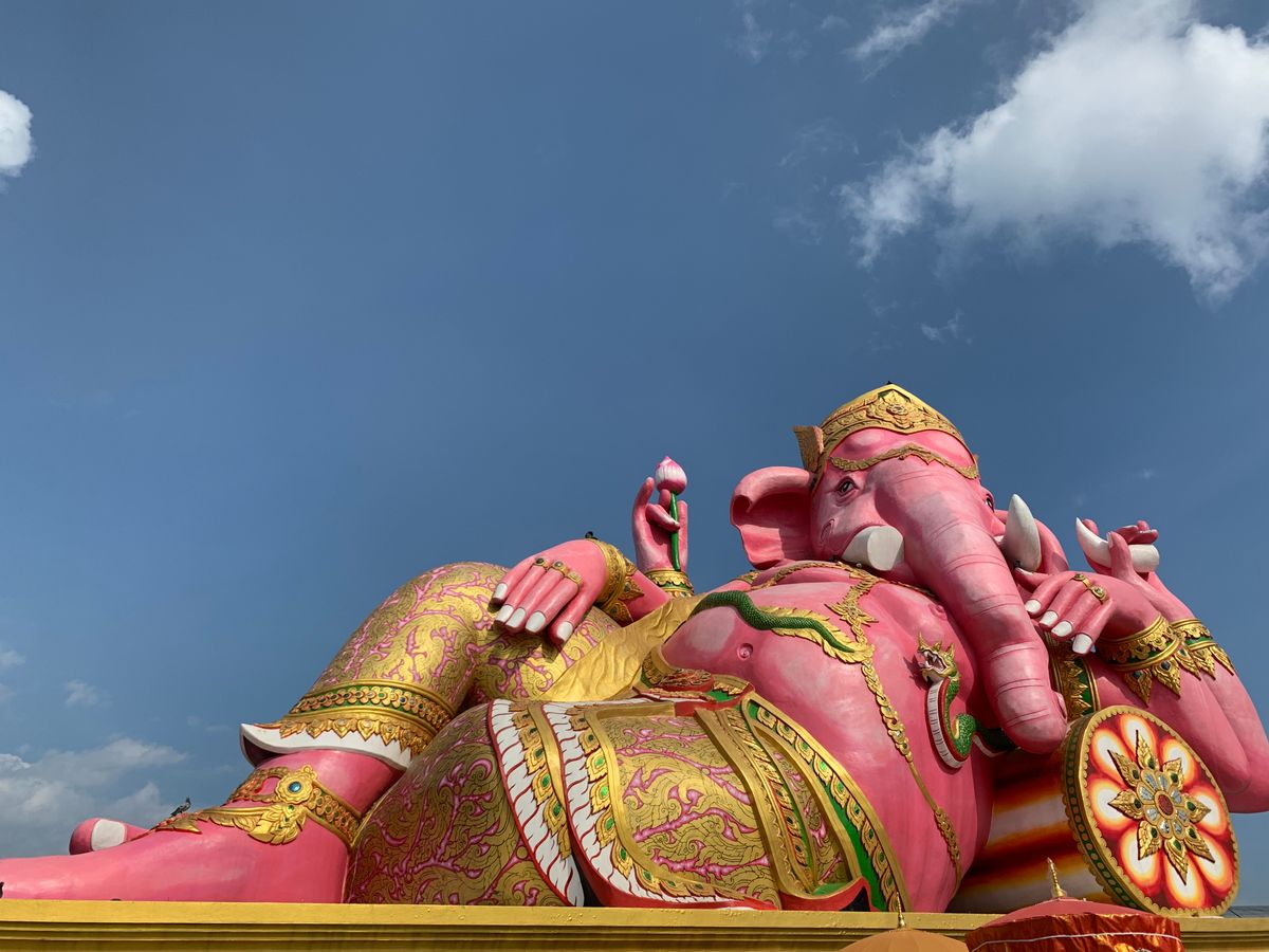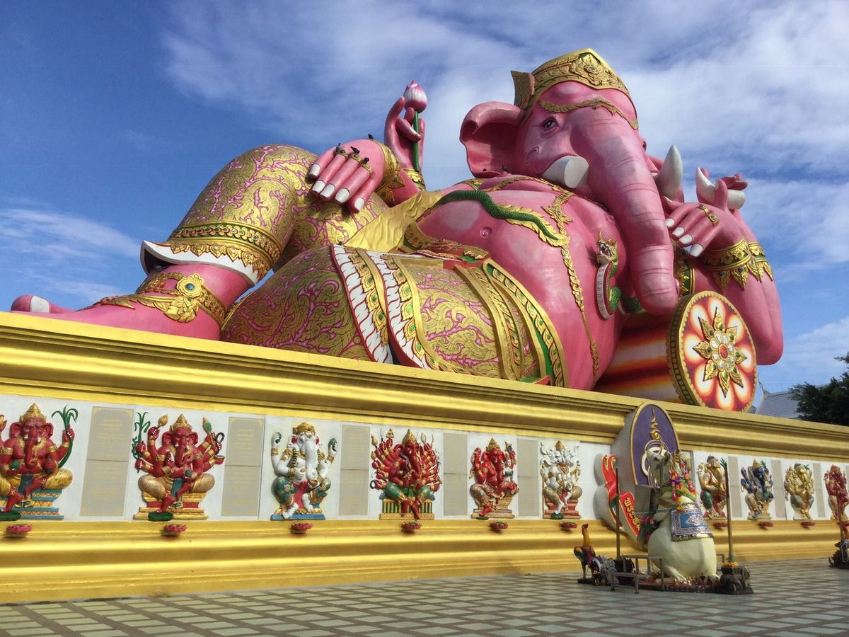 ピンクのガネーシャは、色鮮やかで、青い空に映えていました。