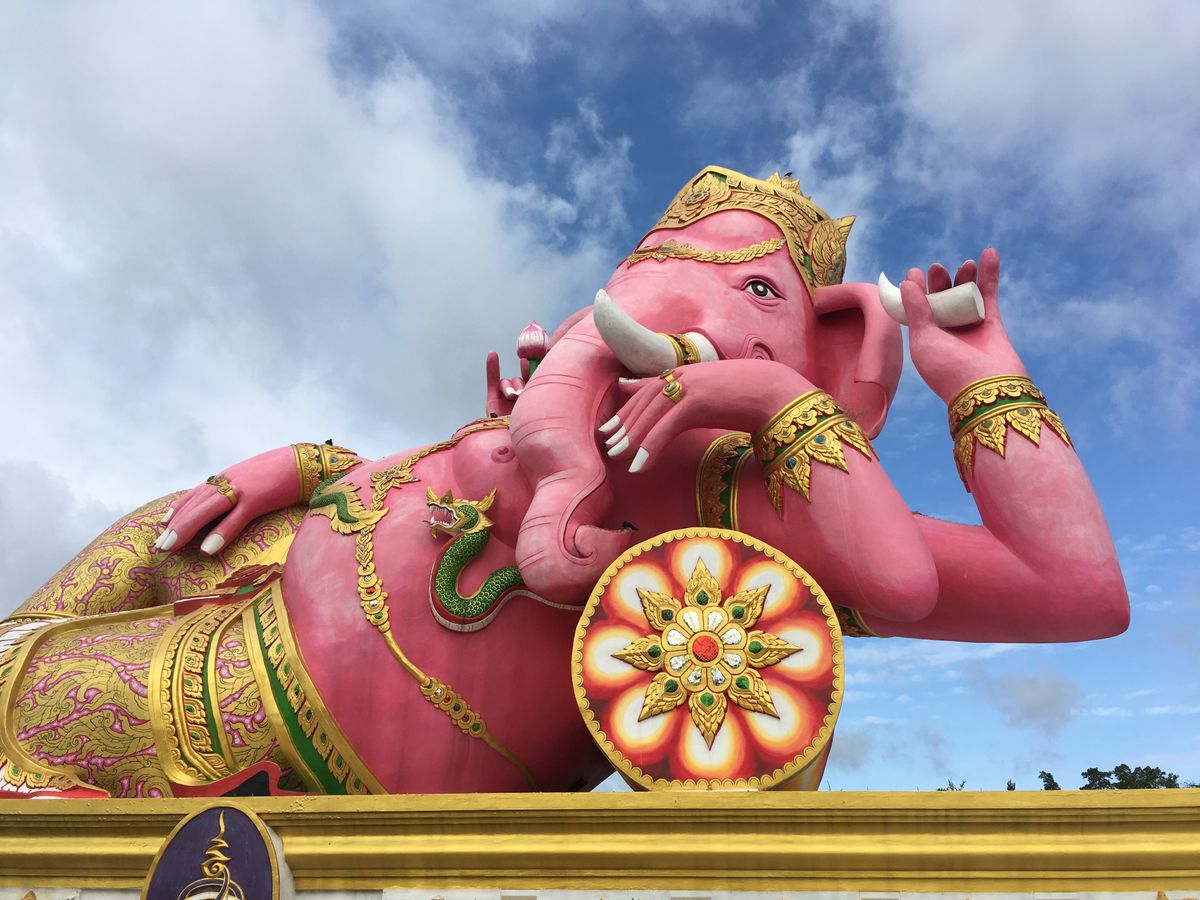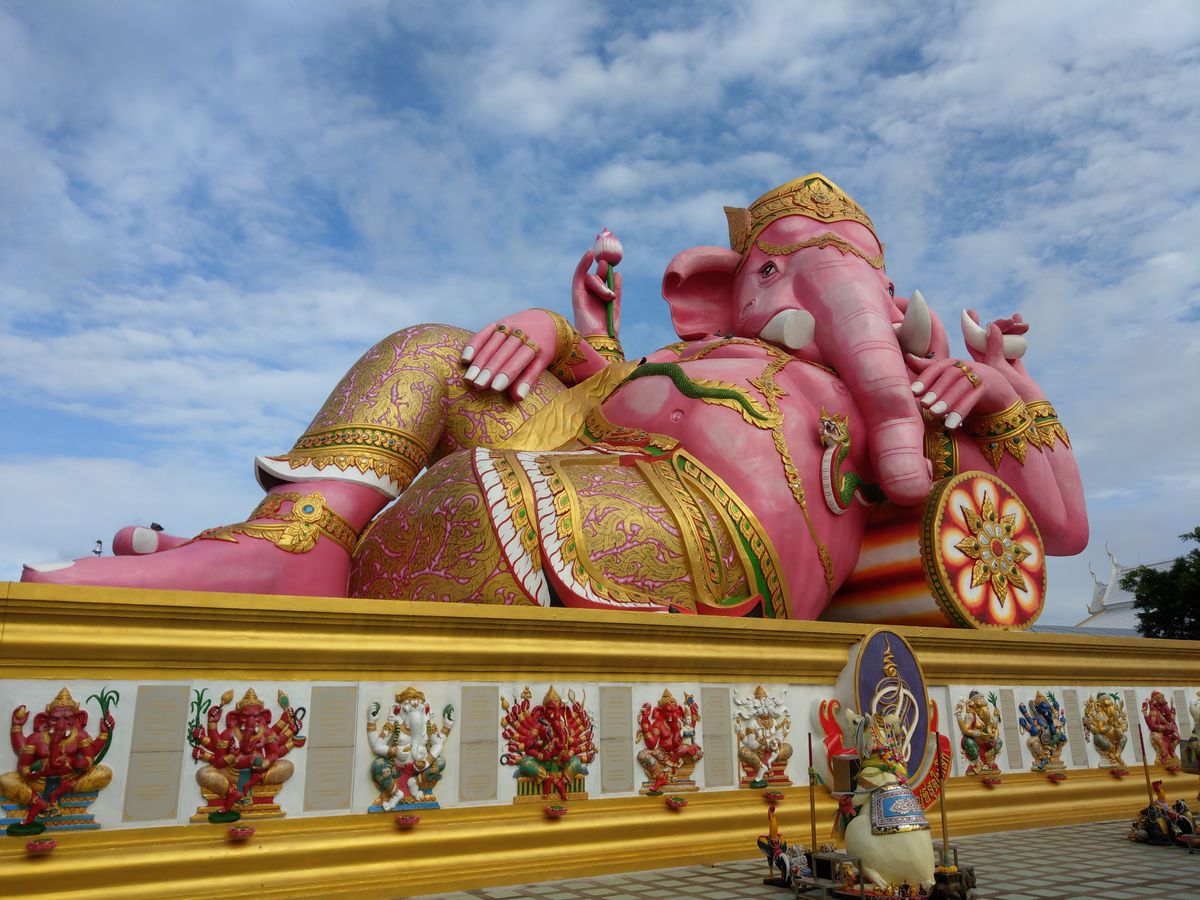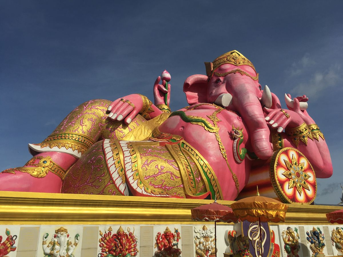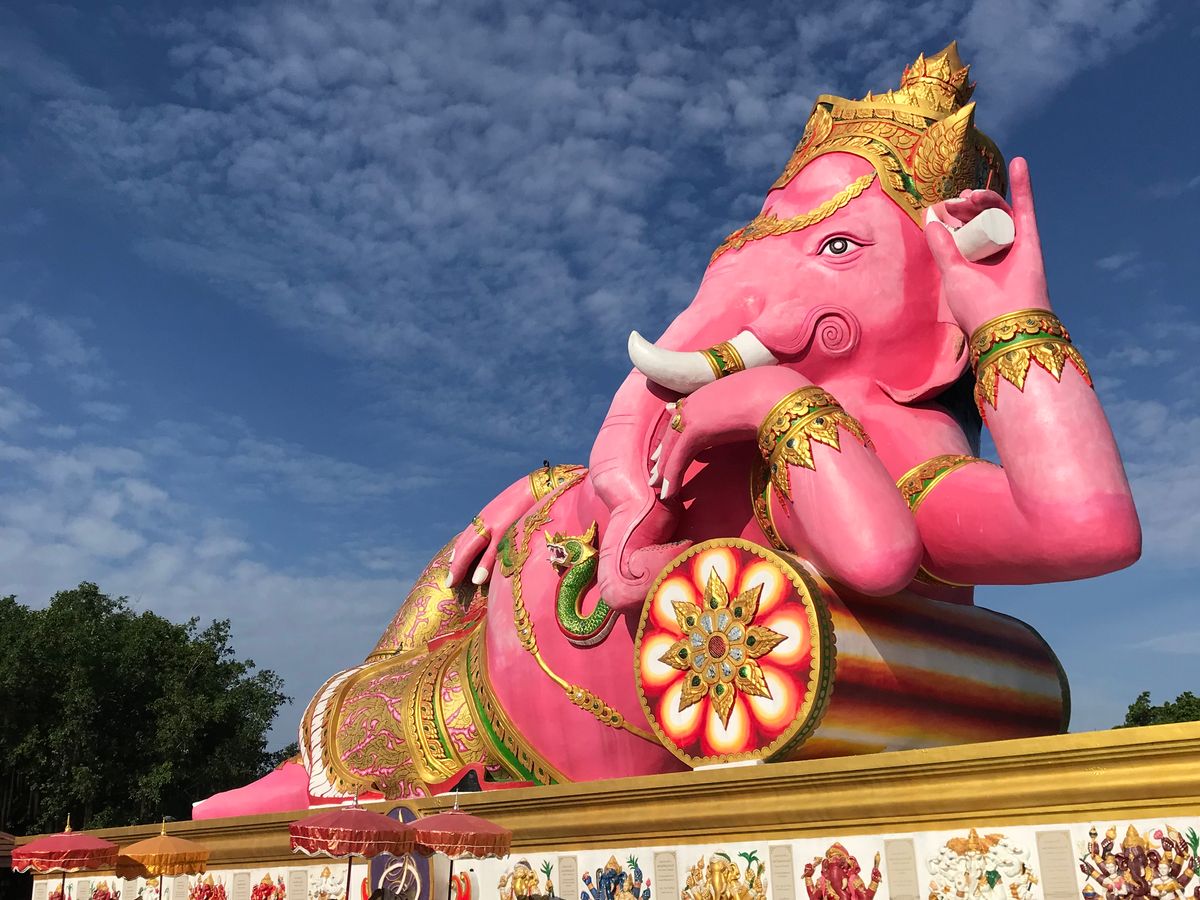ピンクのガネーシャは、色鮮やかで、青い空に映えていました。