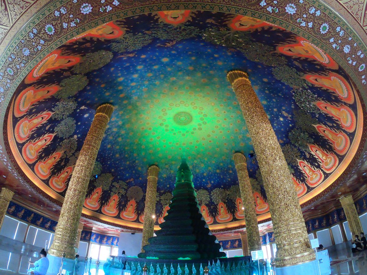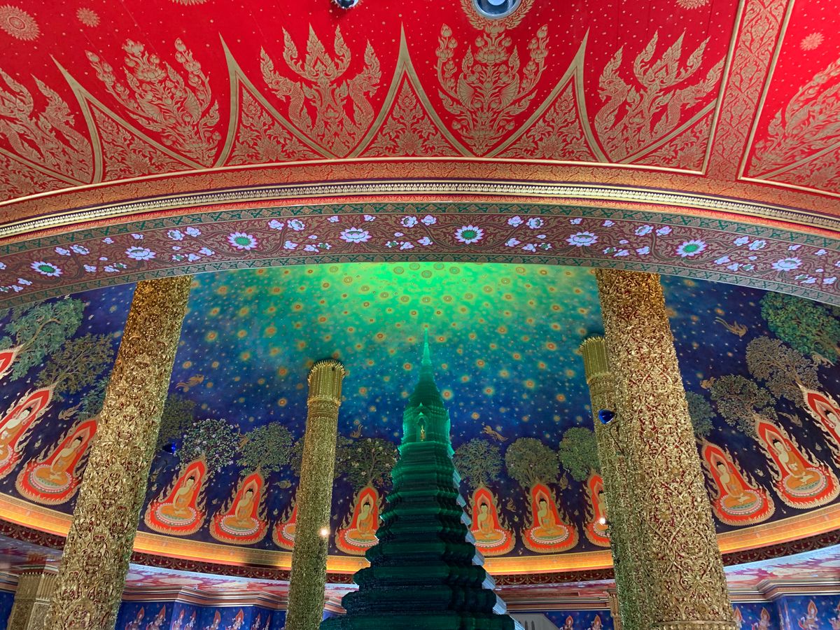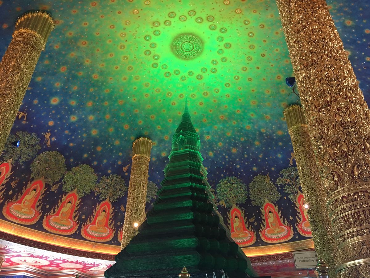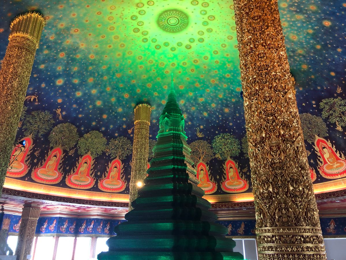 靴を脱いで各階でガイドさんの説明を聞きながら5階まであがると目の前にはあの天井画とエメラルドの仏塔が!実物は想像以上に幻想的で素敵な空間でした。