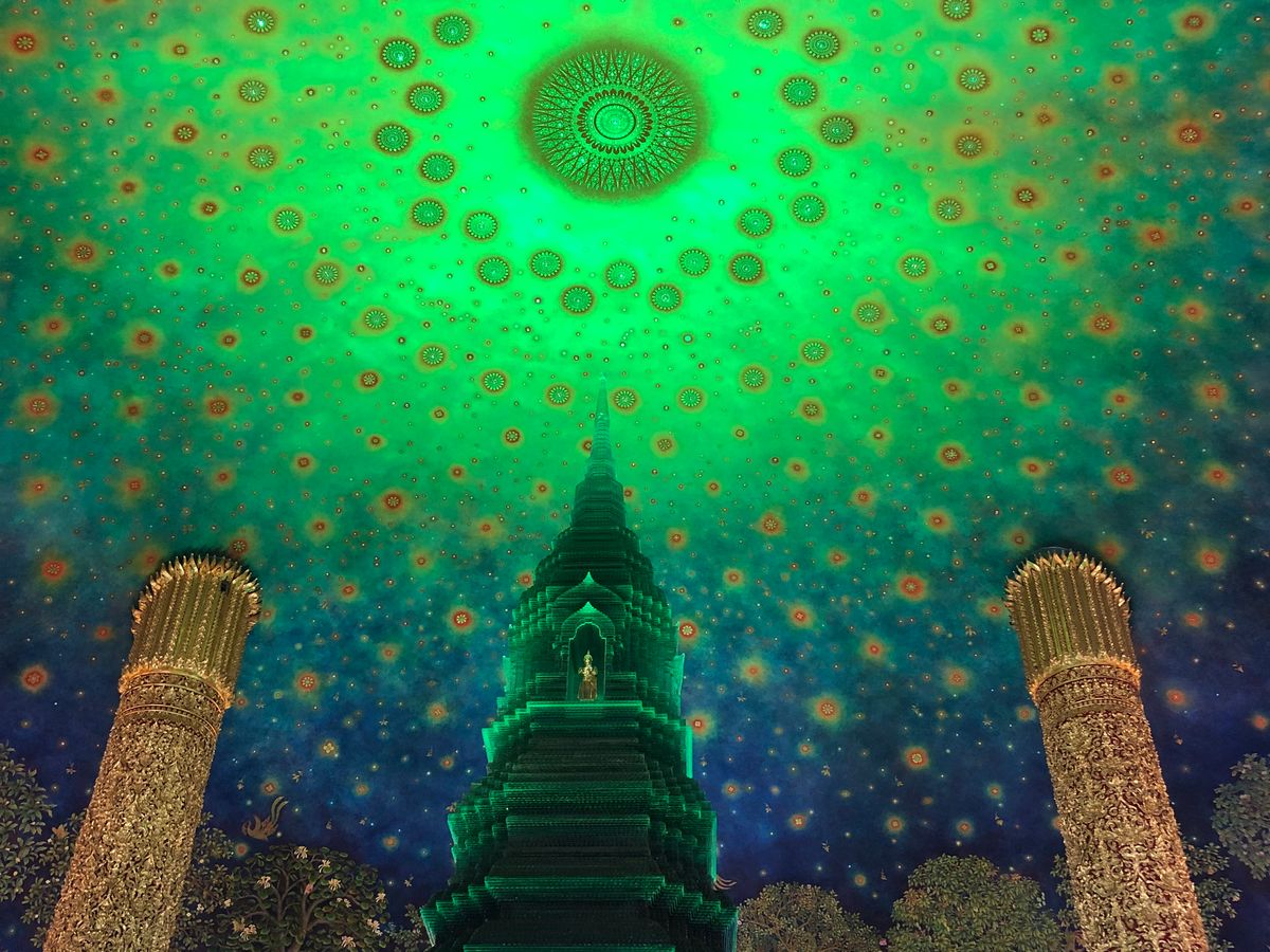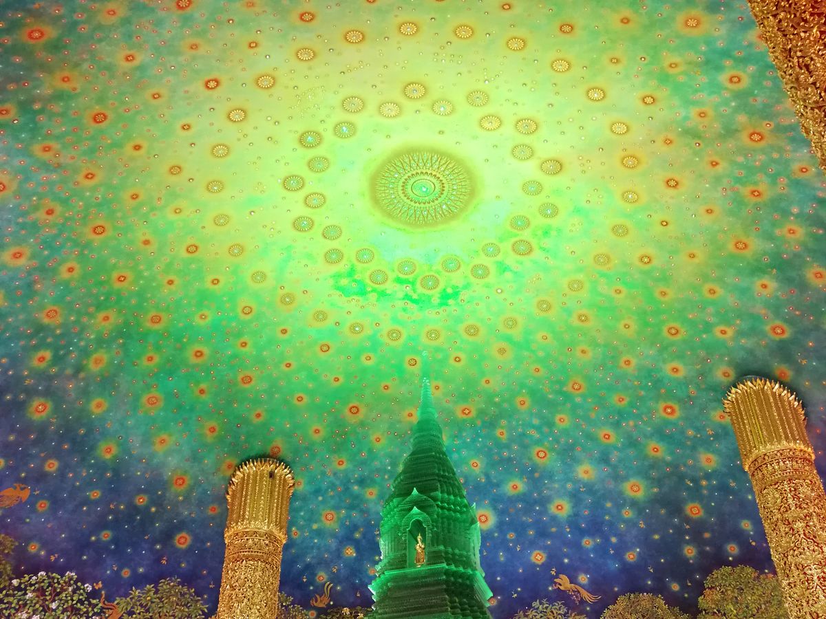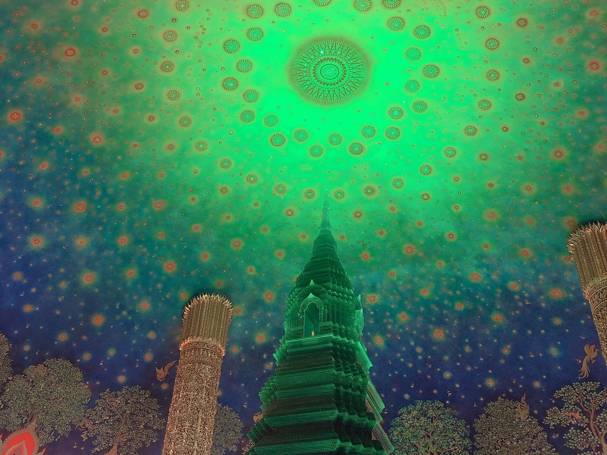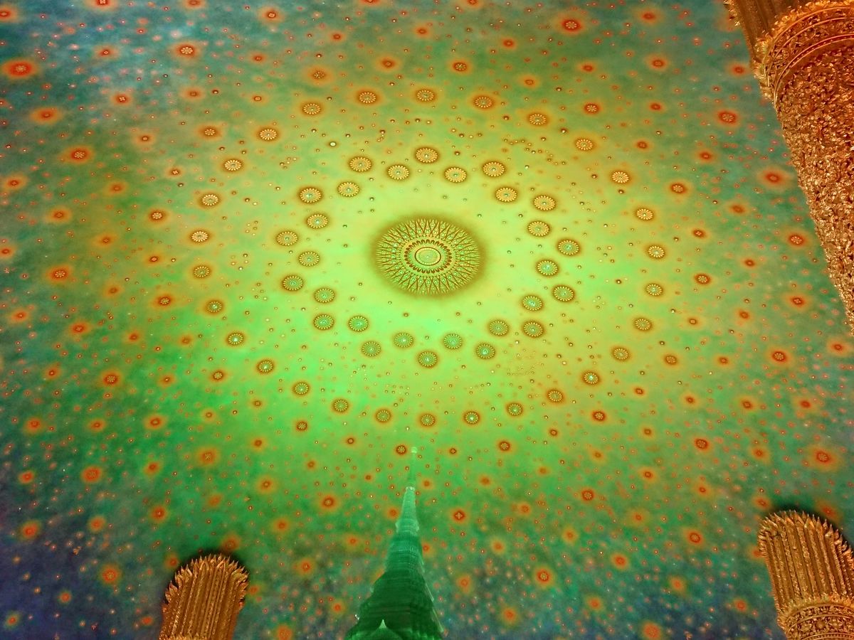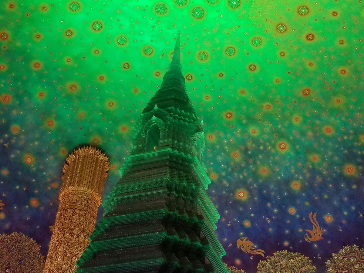 靴を脱いで各階でガイドさんの説明を聞きながら5階まであがると目の前にはあの天井画とエメラルドの仏塔が!実物は想像以上に幻想的で素敵な空間でした。