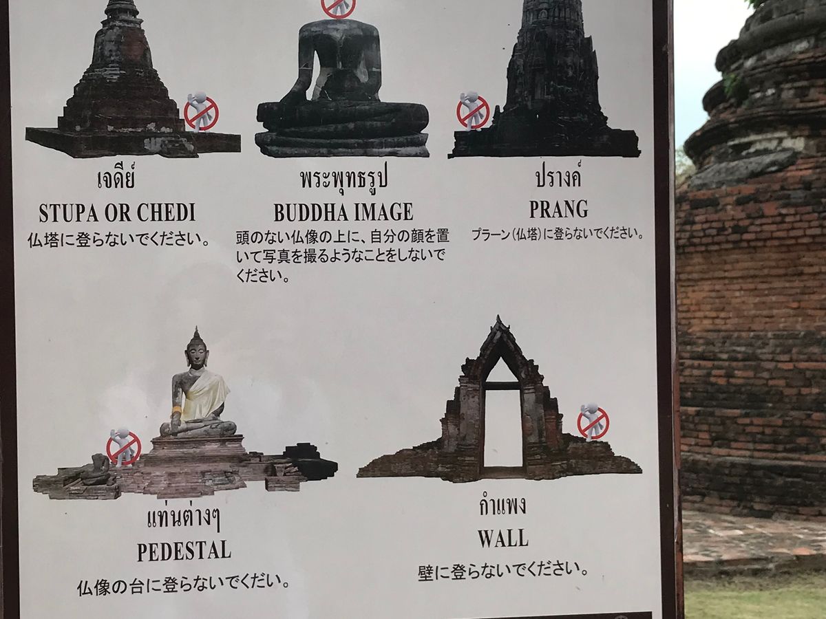 遺跡の前にある注意事項の看板で、遺跡の上に顔をのせて写真とってはダメとかドローンでの撮影はダメとかなるほどなぁと思わせられました。