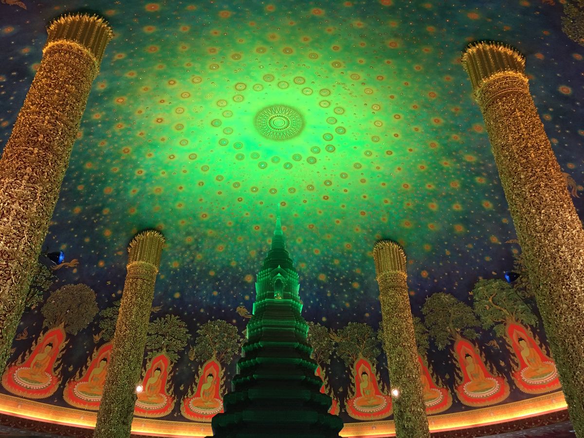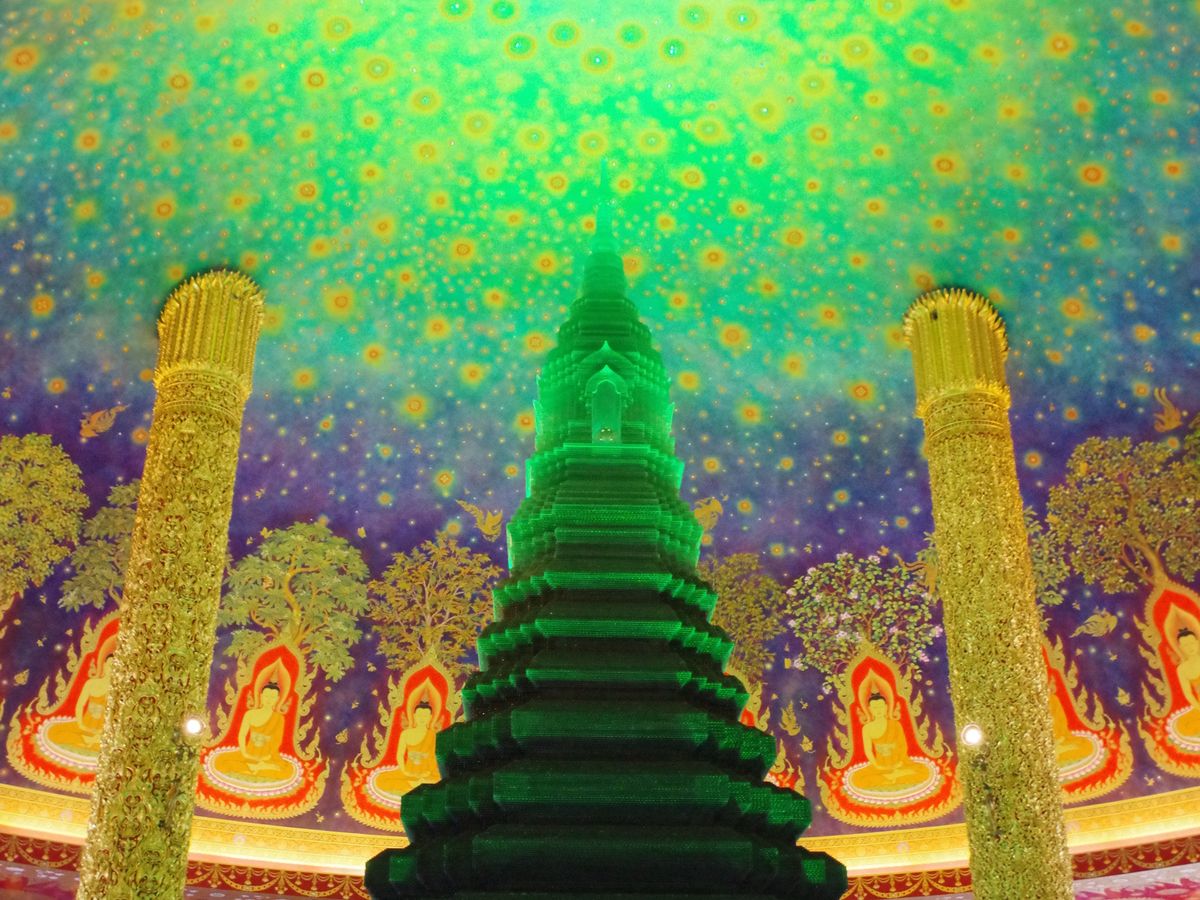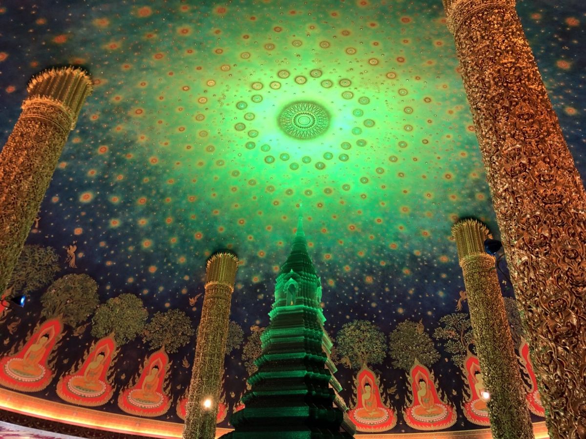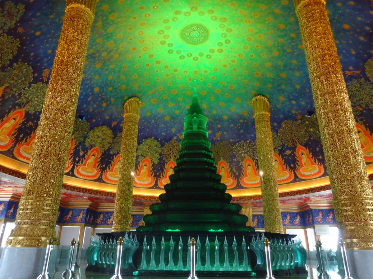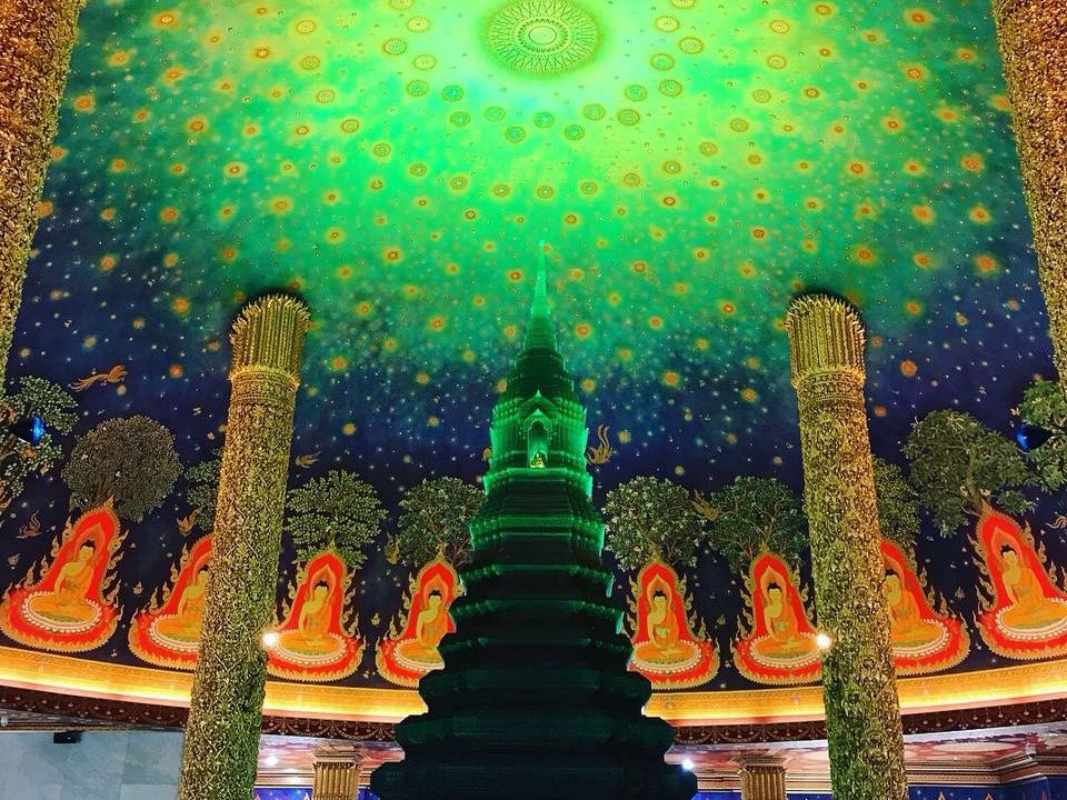 次は待ちに待ったワットパクナム。建物の外観に感動はなくエレベーターで4階に案内されました。エレベーターを出ると思わす感動で「ワァー」って声が出てしましました。エメラルドグリーンに輝く仏塔と天井に描かれた壁画に目が奪われしばらくその場を動くことができませんでした。ガイドさんに2人で記念写真を撮っていただきました。後はゆっくり何枚も何枚も写真を撮りました。