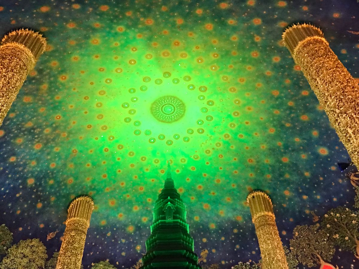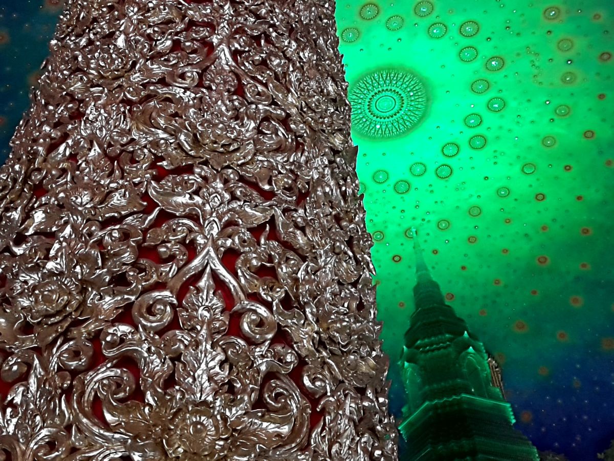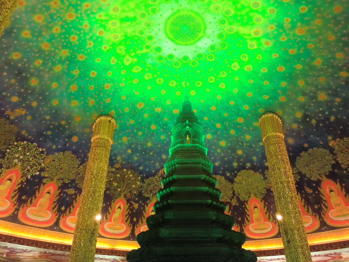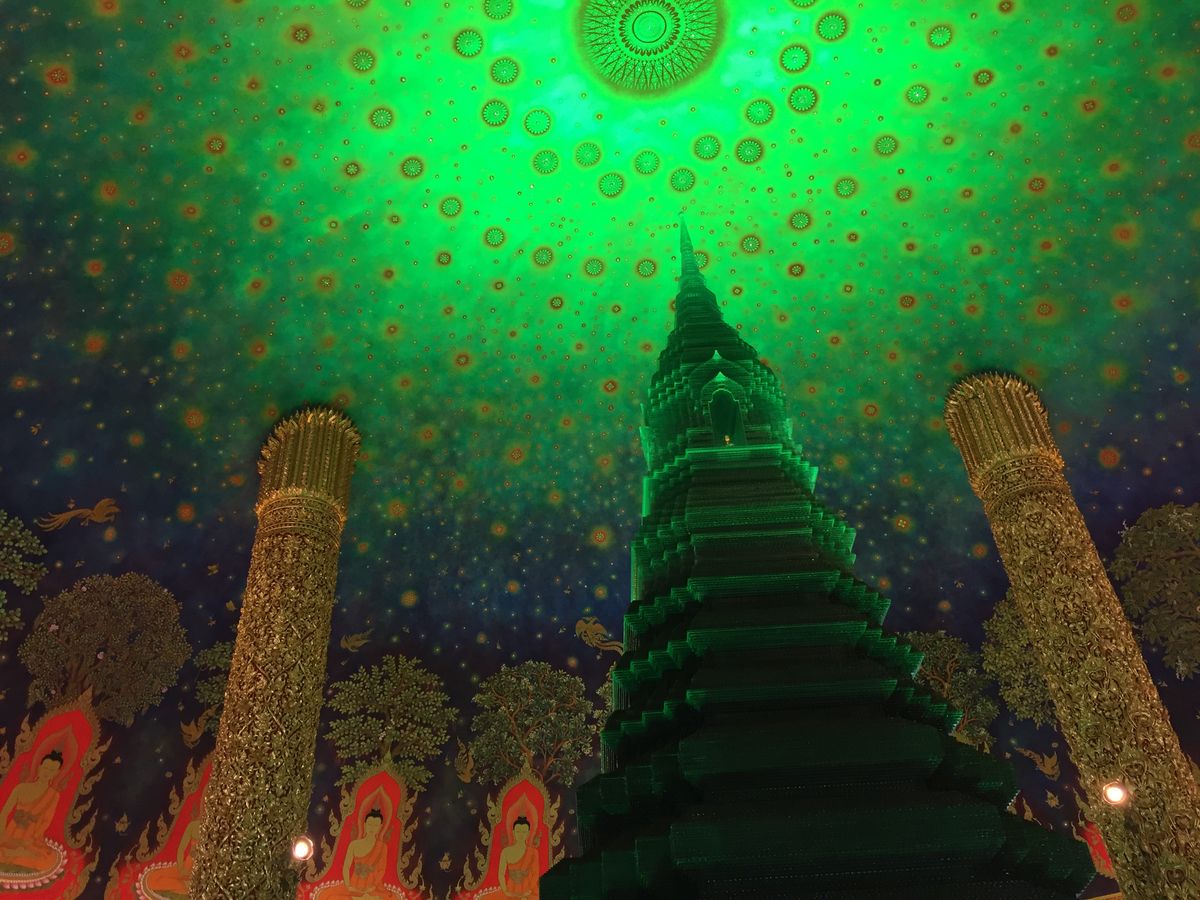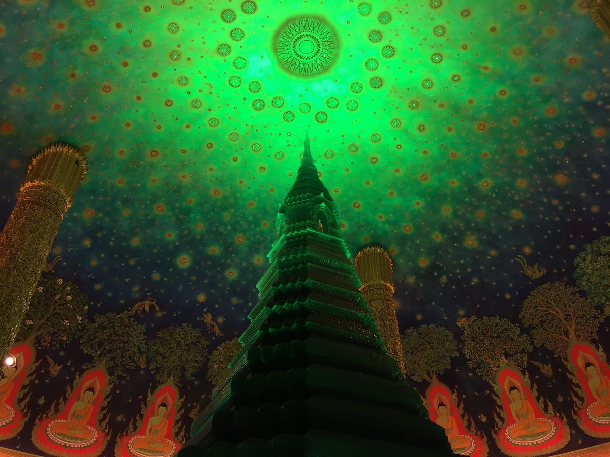次は待ちに待ったワットパクナム。建物の外観に感動はなくエレベーターで4階に案内されました。エレベーターを出ると思わす感動で「ワァー」って声が出てしましました。エメラルドグリーンに輝く仏塔と天井に描かれた壁画に目が奪われしばらくその場を動くことができませんでした。ガイドさんに2人で記念写真を撮っていただきました。後はゆっくり何枚も何枚も写真を撮りました。