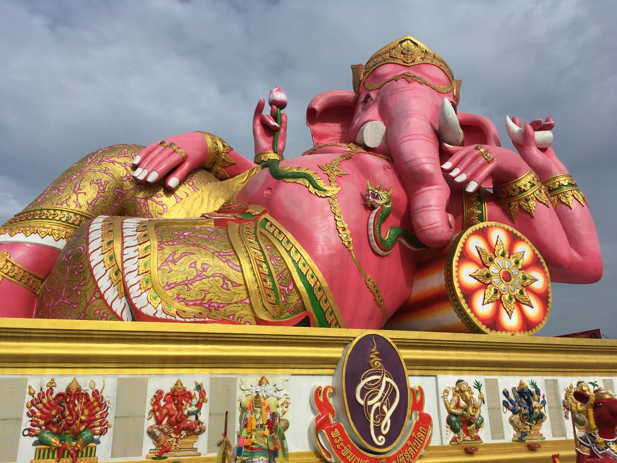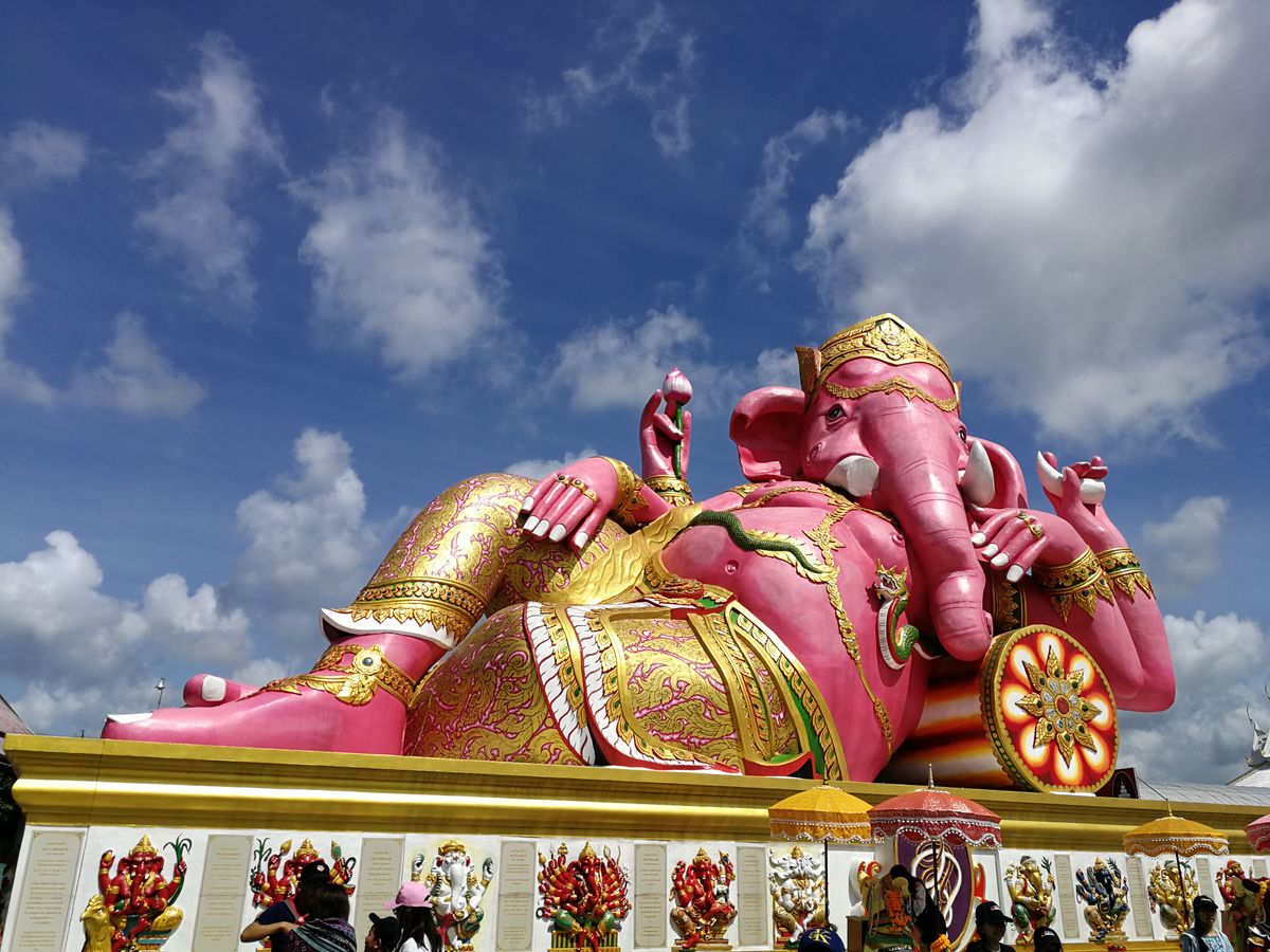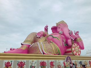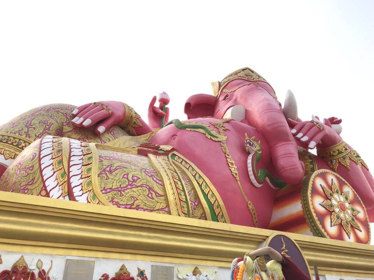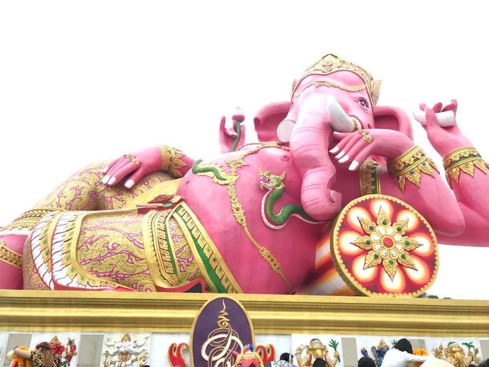 朝6時20分に宿泊ホテルにお迎えに来てもらい、全ツアー客を拾ってバンコクを出発したのが7時くらい。 そこからピンクのガネーシャまで、車を走らせること約2時間。ガイドさんに導かれるままに出店を眺めながら歩いていると突然目の前にピンクのガネーシャが!!感動。