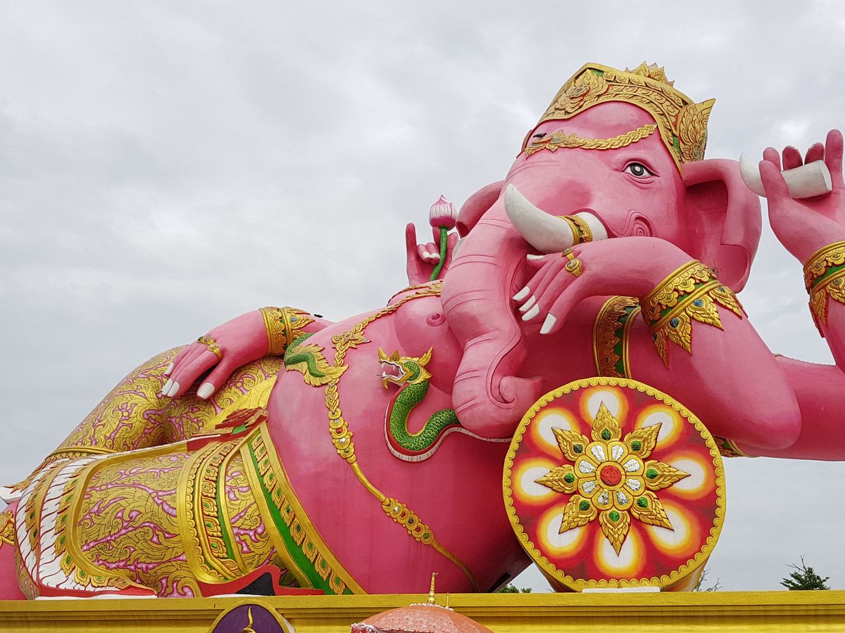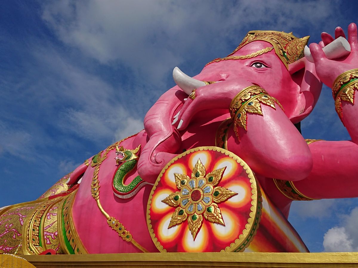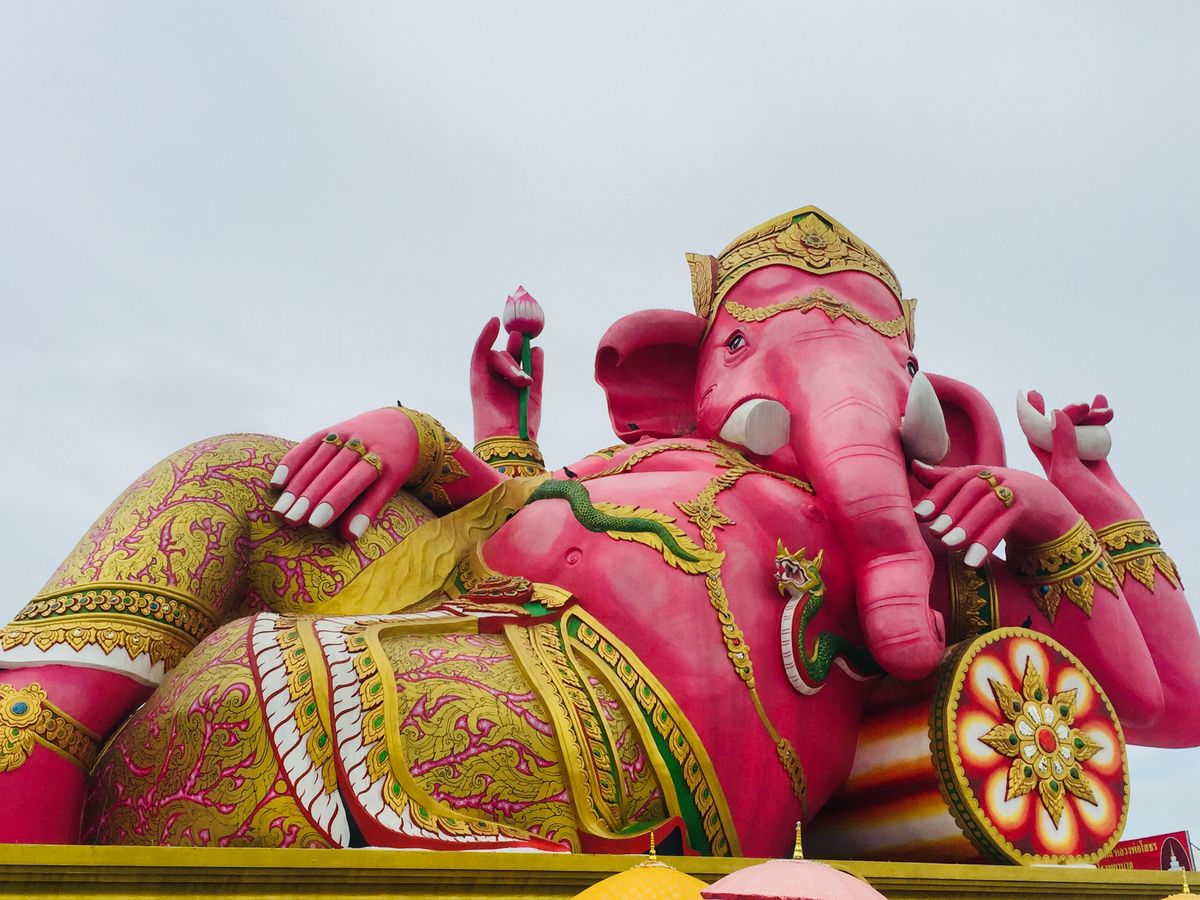 朝6時20分に宿泊ホテルにお迎えに来てもらい、全ツアー客を拾ってバンコクを出発したのが7時くらい。 そこからピンクのガネーシャまで、車を走らせること約2時間。ガイドさんに導かれるままに出店を眺めながら歩いていると突然目の前にピンクのガネーシャが!!感動。