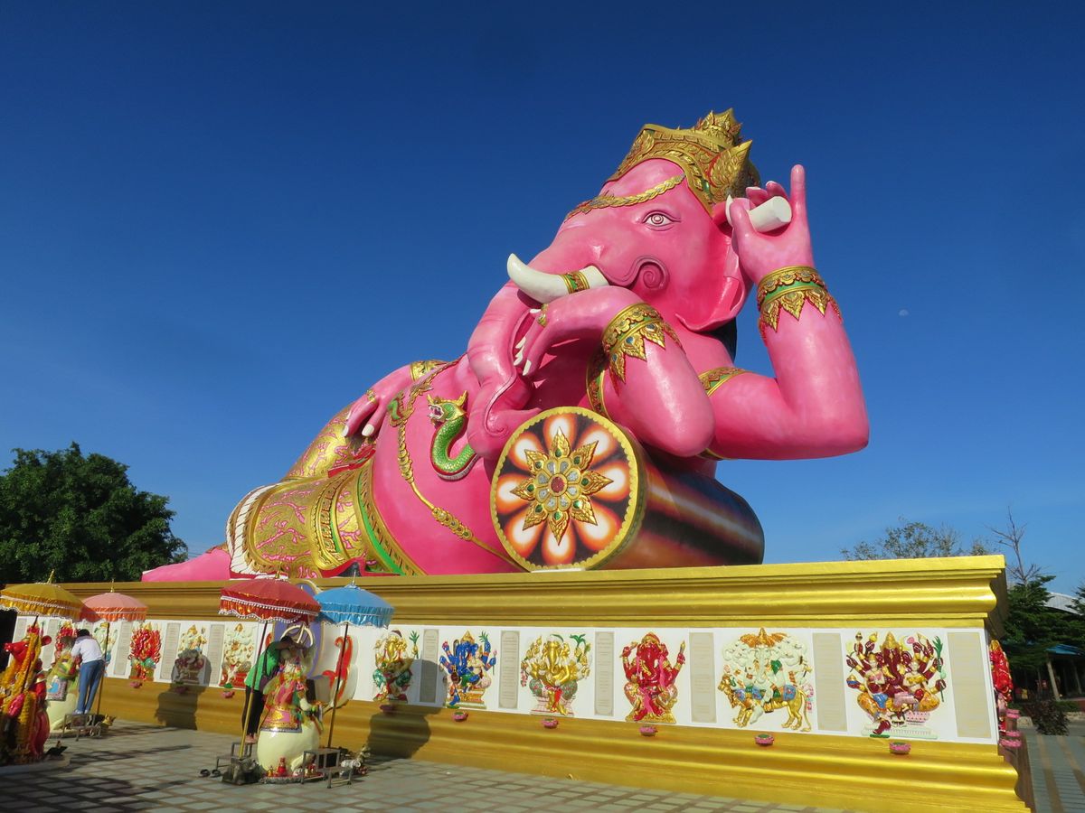 ガネーシャの周りには生まれ曜日のカラーのネズミたちが何となく配置されていて、賽銭用の器を持っている。ガネーシャの土台の側面にもたくさんのガネーシャが張り付いていて、すべてに賽銭用の器がついている。さて幾ら入れるの?と思っていたらそこに入れる用の1バーツコインがたくさん入ったお椀が40バーツで売っていたのでそれを購入して各賽銭箱へ投入して歩きました。ピンクのガネーシャは何とも威厳のある風貌で願い事を言いなさいと言わんばかりに見え本当にここに来れて良かった、願いがかなってしまったような気分になりました。