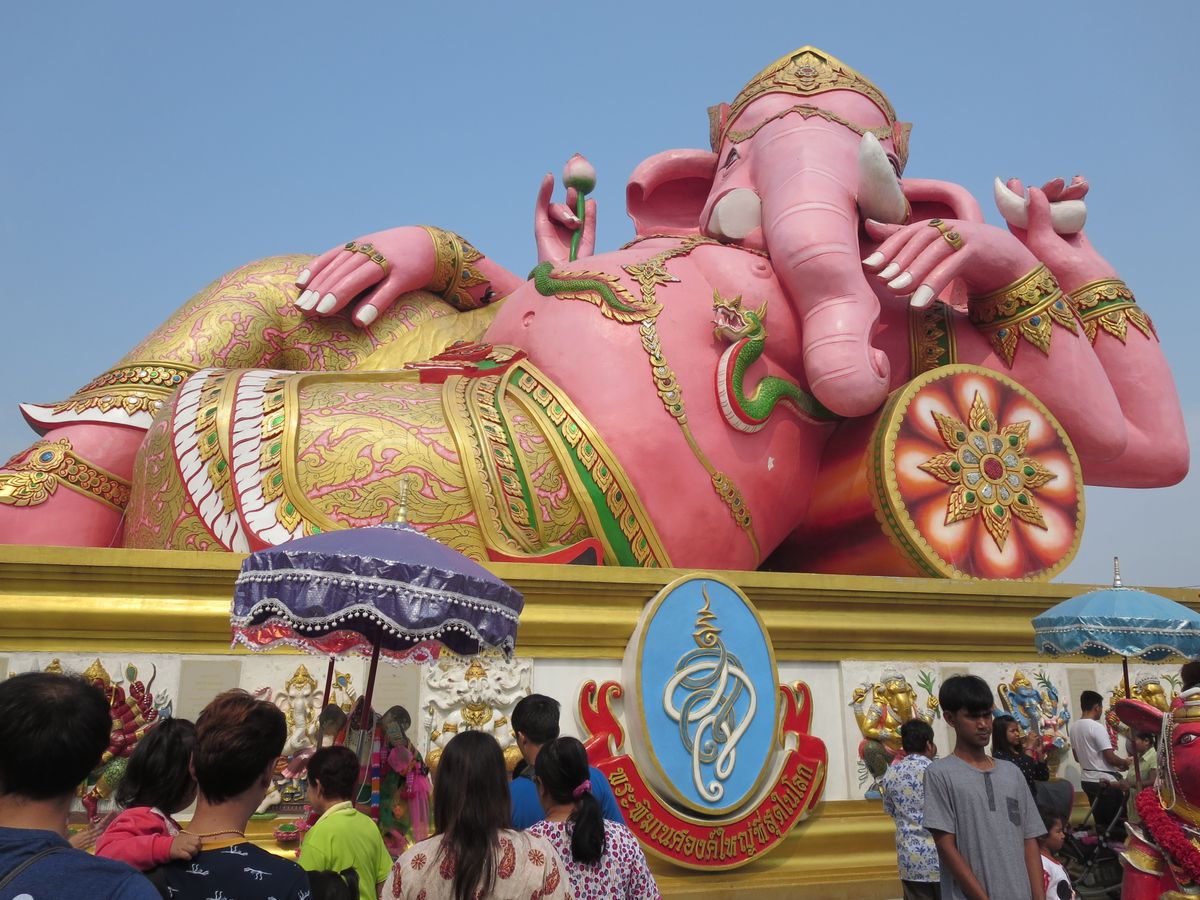 車に揺られ次に向かった場所は、このツアーのメインとも言えるワットマサーン寺院。ここは、あのピンクのガネーシャが祀られている寺院で大勢の人で賑わっていました。日本人にはあまり馴染みのない所ですが、タイ人にとって一度は訪れてみたい寺院の一つだそうです。タイ最大級のピンクのガネーシャが横たわり、人々の願いを聞いています。何でも願いを叶えてくれるということで、大勢の人がガネーシャの乗り物使いのネズミの耳に願いを伝えていました。私も日本語でお願いしてきました。お土産店や露店もたくさんあり、見て歩くだけでも楽しい時間を過ごせます。