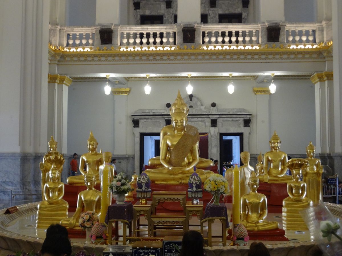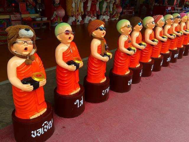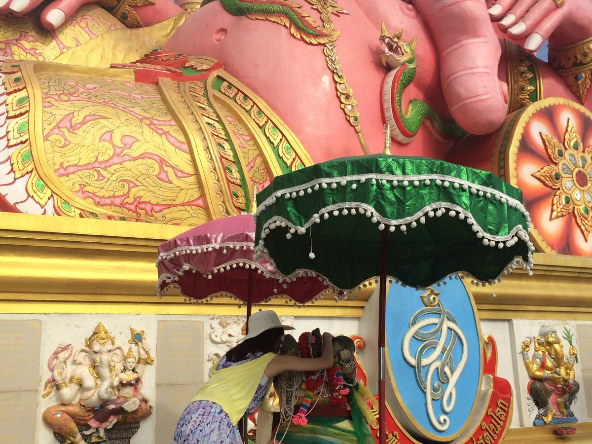 「ピンクガネーシャ」のあるワット・サマーンは、ちょっとしたテーマパークのようなところでした。ピンクガネーシャのほかにも、巨大な仏像や、巨大な龍のオブジェ、お坊さんのリアルな蝋人形などがあります。他の3倍で願い事がかなうという、ピンクガネーシャでは、ガネーシャに直接お願いするのではなく、ガネーシャの乗り物の、ネズミにお願い事をするそうです。自分の生まれた曜日の色のネズミにお願いするといわれていますが、実際には、みんな、いちばん前の金色のネズミにお願いしています。お願い事をするときに、片方の耳から願い事が抜けていかないように、反対側の耳をふさぐそうです。