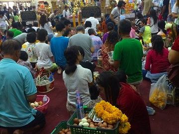 最後にワット・ソートーン寺院に行ってきました。とにかくすごい人で中に入るだけでも一苦労でした。ここは、貴重品には十分注意が必要です。寺院内では、たまごを持って歩いているタイ人を多く見かけました。これは、午前中にたまごをお供えする風習があるそうです。靴を脱いで中に入るとみんな仏像に金箔を貼って願いごとを言っていました。タイ人は、信仰に厚いな~と感じました。入り口付近の所では、タイの舞踊を観ることもできました。ここでも道を挟んだところに露店がたくさんあり、ここも賑わっていました。