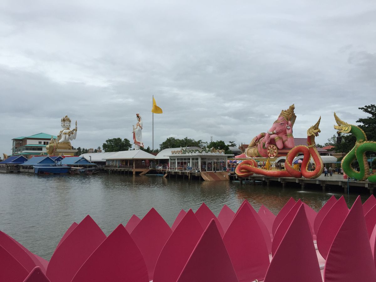 友達と二人で参加しました。バンコクは友達は初めて、私は来たことあったので一般的なツアーでは行かないようなところに行きたかったので友達と相談して決めました。 朝早い出発でしたが午後の割とはやくに終わるためそれからの時間を有効に使えました。ツアーでの車に乗っている距離はかなり遠くに感じたので自分たちでは行くことができないとおもいました。大きなピンクのガネーシャは想像以上に大きく、びっくしりました。日本人を含め外国人の観光客もほとんどみかけませんでした。仏像や龍や蓮の花などはとても大きかったですし、そのほかネズミの像やサングラスをかけたお坊さん?の小さい像など、テーマパーク??のようでした。私もガネーシャとお話ができるというねずみさんの肩耳をふさいでお願いをしました。ガネーシャの周りにねずみさんが何体もいますがガネーシャさんに直接お話しできるのはガネーシャに向かっている白いねずみさんだそうです。