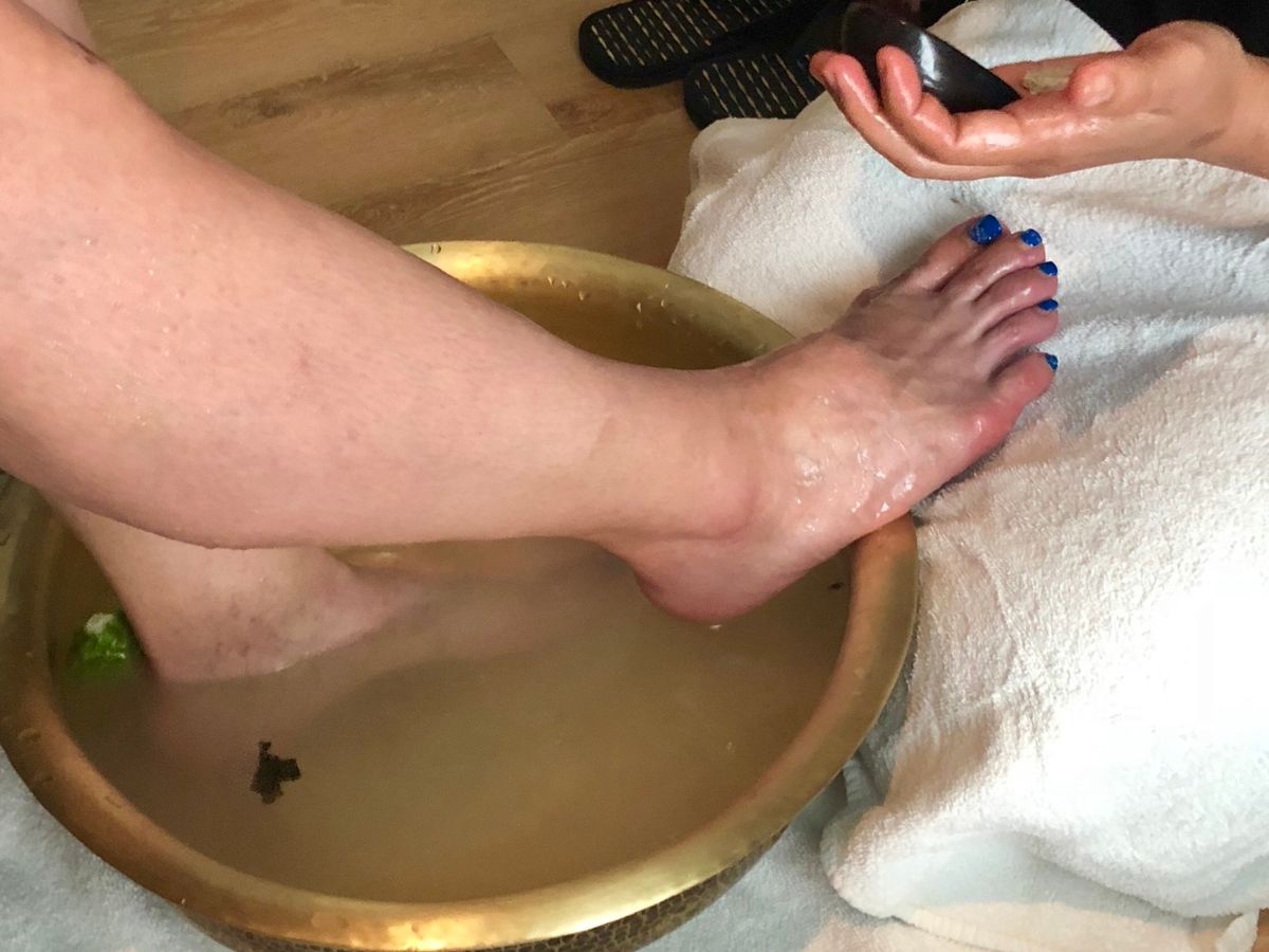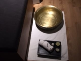 施術室に通され紙パンツに履き替え、バスローブを羽織りお着替えをして足を洗ってくれるのですが、ハーブソルトに生のカフィラムを絞って足湯に入れてくれます☆カフィラムがすごくいい香りです。