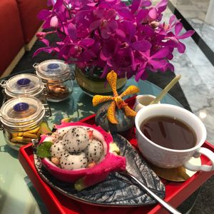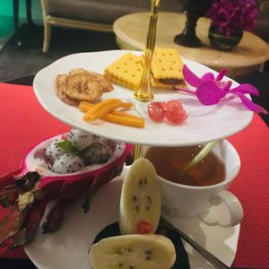 ご飯の後アフタヌーンティースタンドでフルーツと紅茶とお菓子が出てきます。