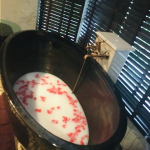 最後にバラの花びらが浮かんだバスタブに入浴(入浴中にもお茶とお菓子が出ます)、その後、自分でシャワーとシャンプーを済ませて施術は完了です。(ここまでで30〜40分)