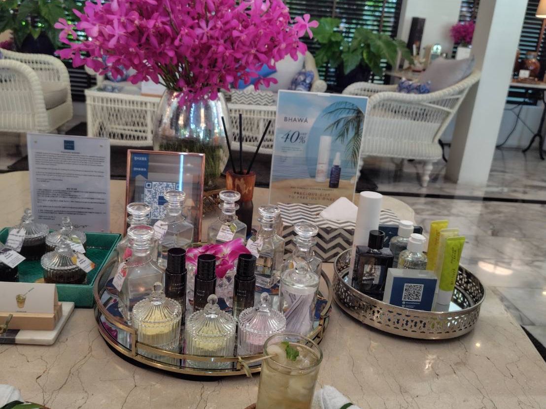 身支度を整えて、エントランスホールに戻るとお茶とカオニャオ・マムアン(写真あり)が供されました ここでも時間を巻きで飲食しなければならなったのが本当に心残りです オリジナルコスメのコーナーもあるので余韻にひたりながら色々と見たかったです セラピストさんへのチップはエントランスまで案内するともう会えないので、渡すならお部屋を出た時点でお礼と共に渡すのがベストです 今回はカウンセリングをして下さった女性を呼んで渡してもらいました 慌ただしく後にしたのですが、最後かわいい若い女性スタッフが見送りについて外まできてくれたり、とても楽しい素敵なスパ体験となりました