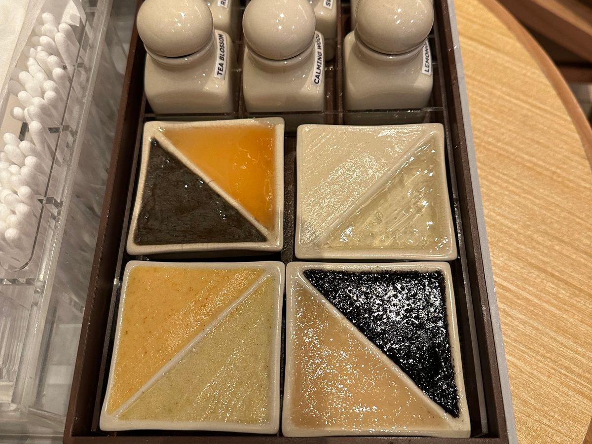 施術が終わって起こされる(恐らくほぼ皆寝ます)と室内のシャワースペースでオイルを流します シャンプー等のアメニティはスパオリジナルのものが自由に使えます ドライヤーはもちろん、スキンケアも同じく色々と揃えてあります 全体的にオイルが多めでした このあとも予定があったので2人で一緒にシャワーになったのが友達に申し訳なかったのですが、急いでなければ個別にシャワーを使って準備をすることも可能です