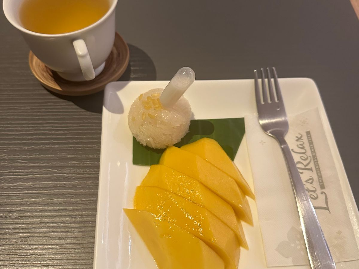 最後に食べたMango with sticky rice は見た目かわいく、味もおいしく、タイのいろいろな場所で食べましたがこのスパのが一番おいしかったかも。